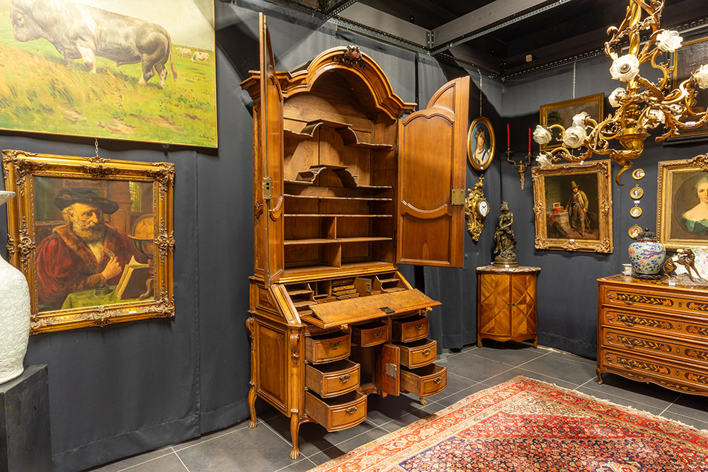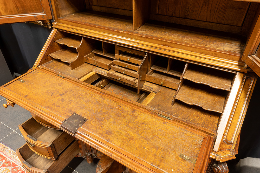 superb 18th Cent. cherry-wood bureau-bookcase with at the bottom a “kneehole” bureau with seven drawers, a door and a drop-down worktop (with a beautiful interior with a reading shelf) and at the top two doors (with the original étagères behind them) and a galvanized head with a central rocaille
