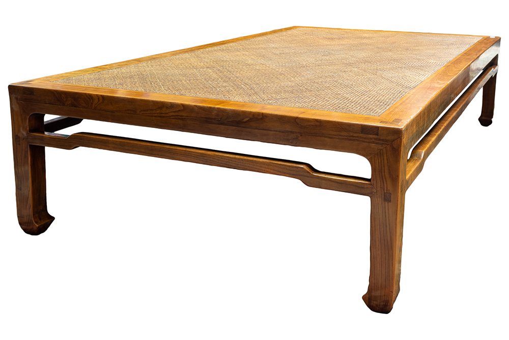 Mooi antiek Chinees opiumbed uit de Qing-periode in fruithout met typisch bovenvlak in gevlochten riet – tot salontafel omgevormd – 46,5 x 213 x 115 cm