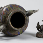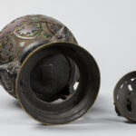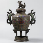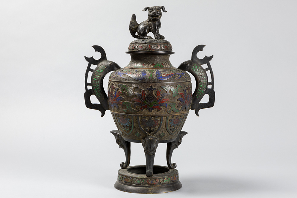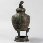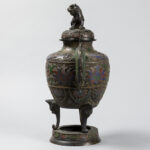 antique Chinese cloisonné vase with three legs on a round base and with its lid with temple lion