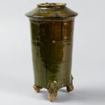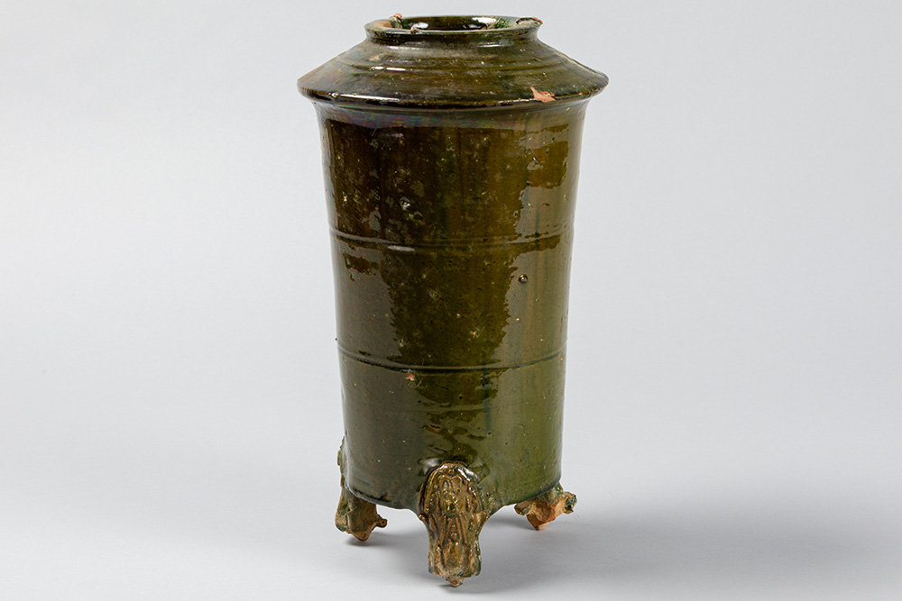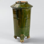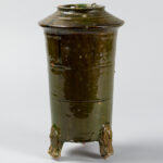 CHINA – HAN – DYNASTIE (206 voor – 220 na Christus) grafvondst in aardewerk met goed bewaarde groene glazuur : rijstcontainer op drie pootjes – hoogte : 29 cm met certificaat