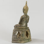 LAOS / LUANG PRABANG – 13° EEUW sculptuur in brons met ingelegd zilver : “Zittende Boeddha met ‘touching the earth’-houding’ – hoogte en breedte : 28,7 en 17 cm prov : galerij Daroun