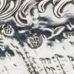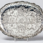 schaal met een repoussédecor met geanimeerde taferelen in massief zilver, gemerkt “Duitsland 800” – 26,5 x 20 cm – gewicht : 236 gram getekend