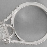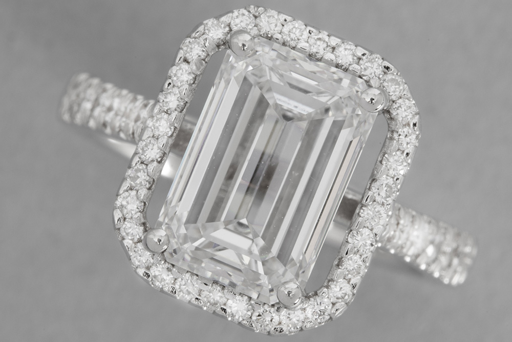 Solitaire blauwwitte (F) CVD kwaliteitsbriljant (Vvs) in emeraudeslijp van zeker 5 karaat, gezet in een modieuze ring in witgoud (18 karaat) bezet met ca 0,55 karaat blauwwitte (F) kwaliteitsbriljant (Vs) – gewicht : 7,5 gram