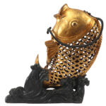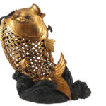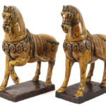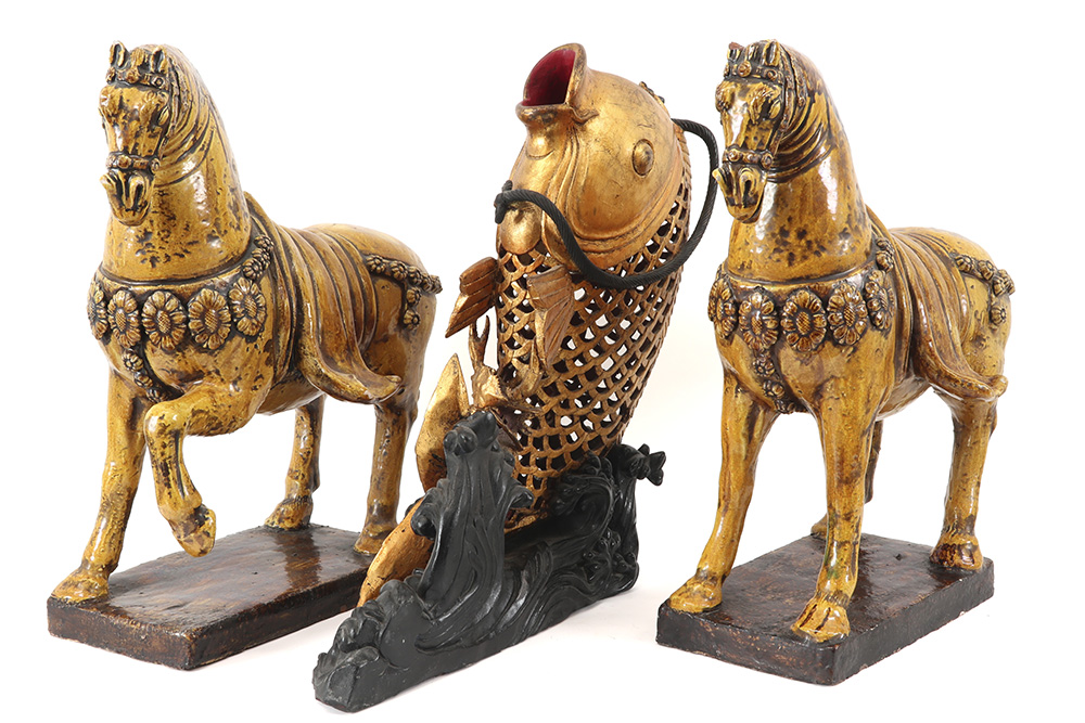 three Chinese items : a pair of horses in glazed earthenware and a wooden sculpture of a fish
