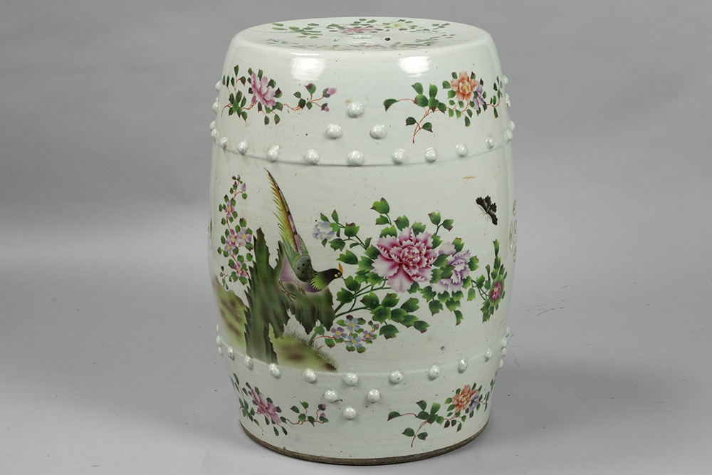 ’antique’ Chinese garden seat in porcelain with a ‘Famille Rose’ decor