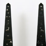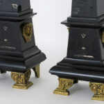Antiek paar zgn “Retour d’Egypte”- sierstukken/obelisken in oud-Egyptische stijl, gerealiseerd in zwarte marmer, versierd met hiëroglyfen, en gedoreerde brons – hoogte : 46 cm
