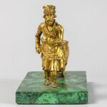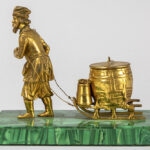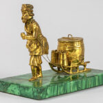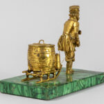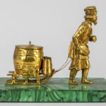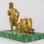 small antique presumably Russian sculpture in gilded bronze on a malachite base : “Man with milk barrel” (= inkwell)