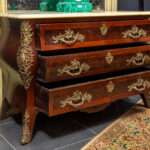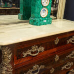 baroque Louis XIV style chest of drawers with typical bronze mountings and handles and with marble top