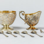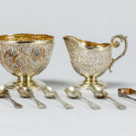 GEORGE EDWARD & SONS antieke negendelige roomset in massief zilver, gemerkt “925 – Londen 1888”, met fijnuitgewerkt bloemetjesdecor – totaal gewicht : 270 gram – in originele etui getekend