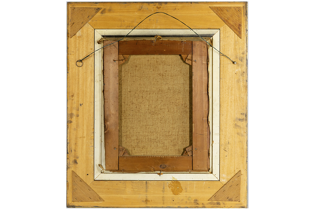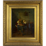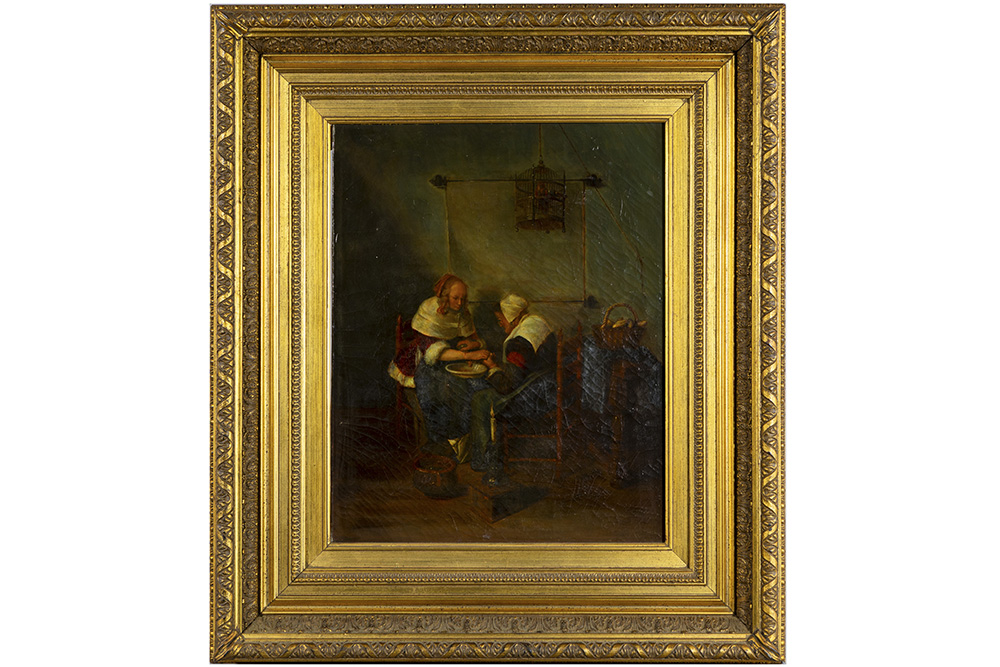Negentiende eeuws Nederlands olieverfschilderij op doek : “Hollands interieur met twee dames en vogelkooi boven tafel” – 48 x 38,5