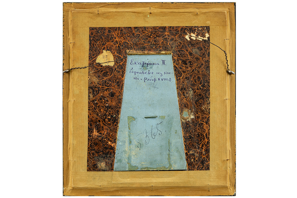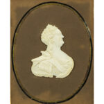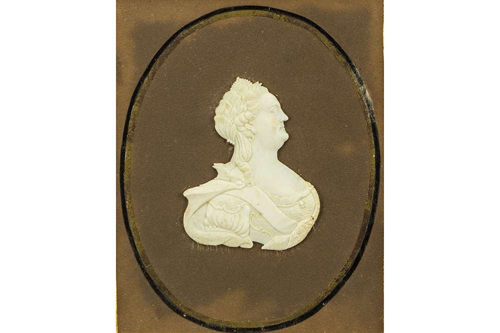 RUSLAND / KHOLMOGORY – eind 18°/begin 19° EEUW fijngesculpteerde en gegraveerde miniatuur in walrusbeen met het portret van Tsarina Catharina de grote (1729 – 1796) – ingekaderd (21 x 19 cm) ref. : een soortgelijke miniatuur wordt bewaard in het Metropolitan Museum (inventarisnummer 1972.145.36)