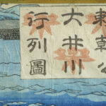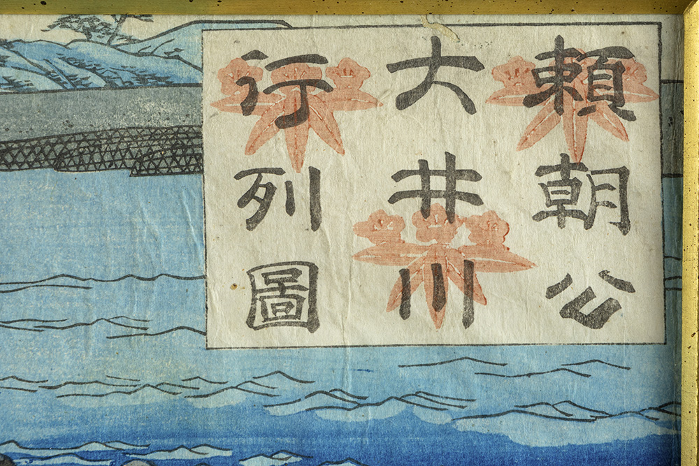 Japanese Yoshitsuya Koko woodcut “The long procession of shogun Yoritomo is crossing the Oi river” (“Yoritomo-ko Oi-gawa Gyoretsu Zu”)