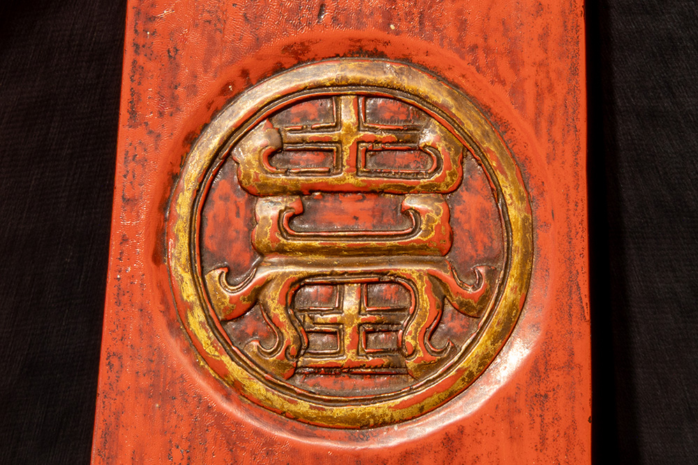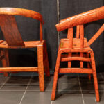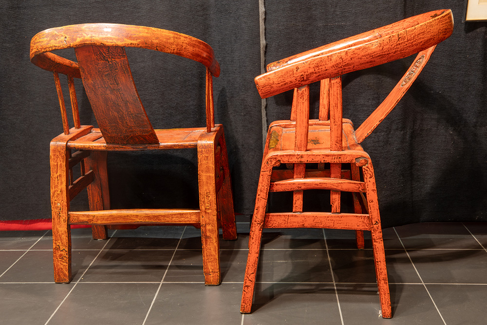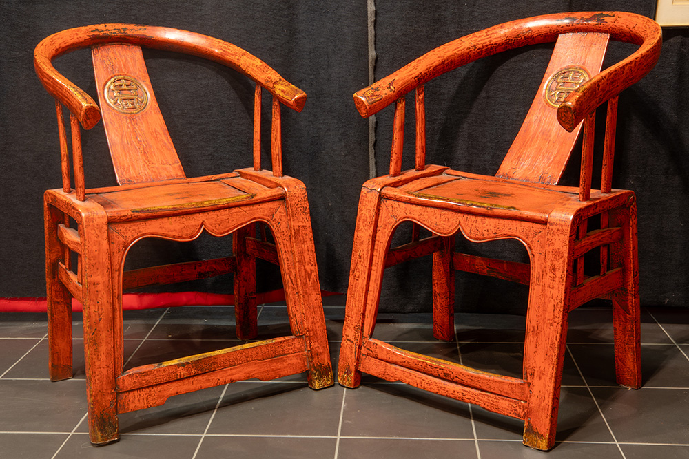 Paar antieke Chinese armstoelen in roodgelakt hout met rug versierd met een gesculpteerd medaillon – 90 x 57 x 70 cm