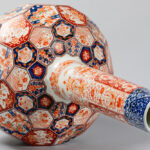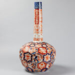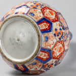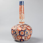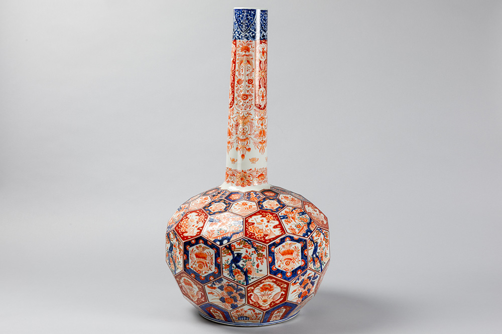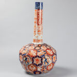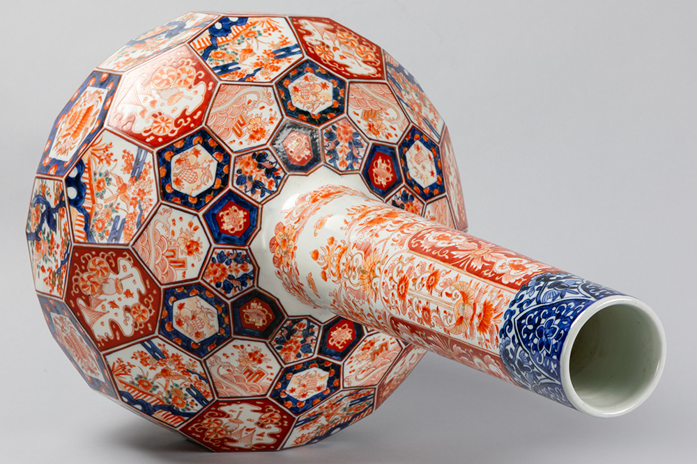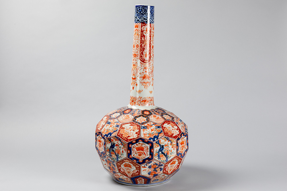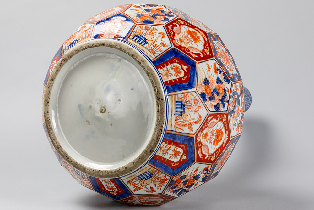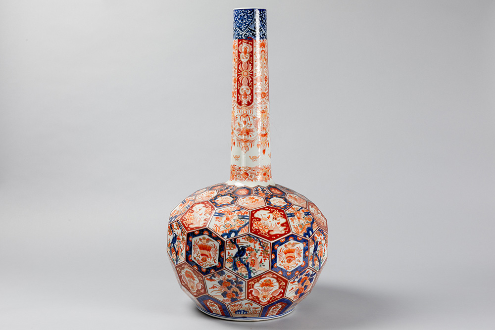 Vrij grote negentiende eeuwse Japanse Meiji-buikvaas met fleshals en gefacetteerd oppervlak in porselein met Imari-decor – hoogte : 68 cm