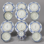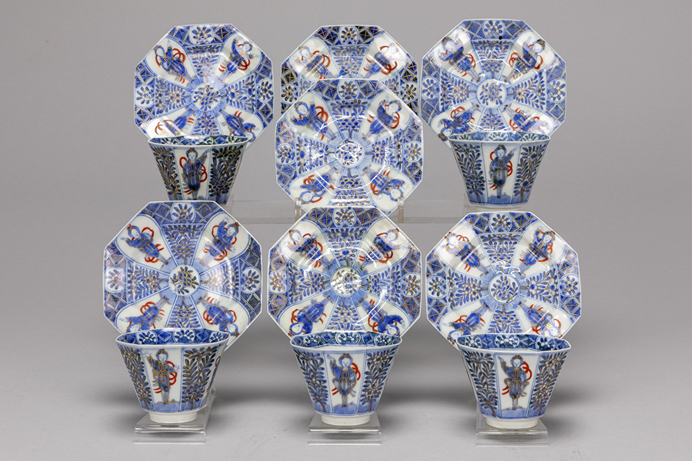 Set (12 stuks) gemerkt achttiende eeuws Chinees porselein met een decor met ondermeer figuurtjes in blauwwit opgehoogd met rood en goud : vijf theetasjes en zeven ondertassen