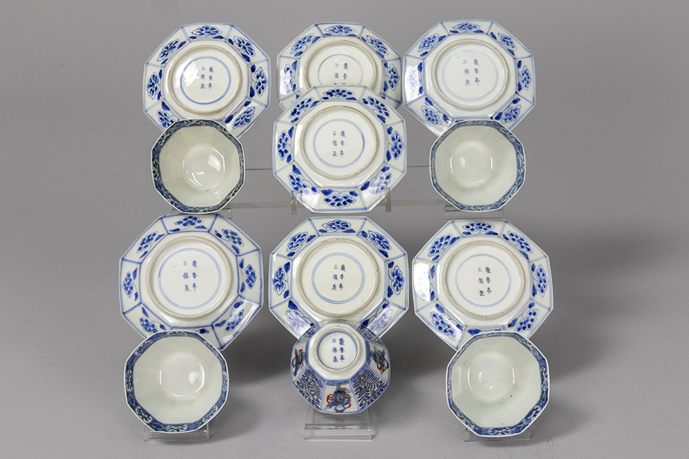 set (12 pcs) marked 18th Cent. Chinese porcelain with a blue-white decor with gold and red : five teacups and seven saucers