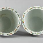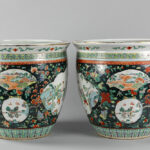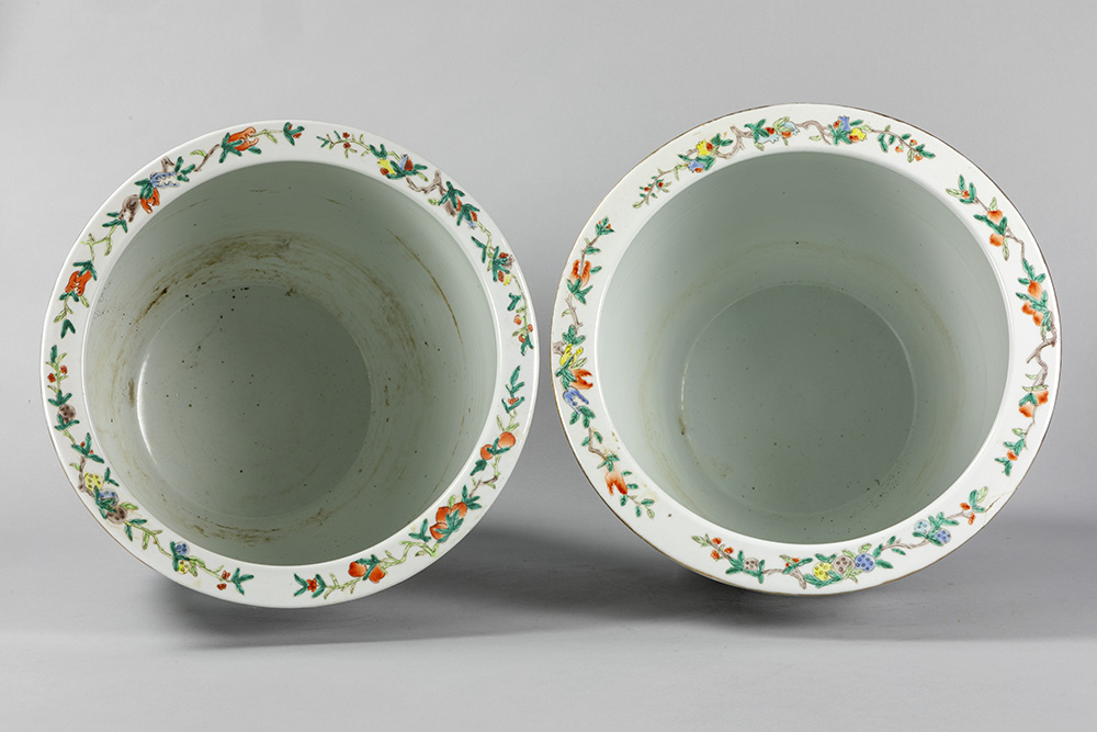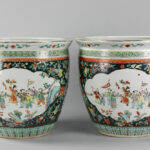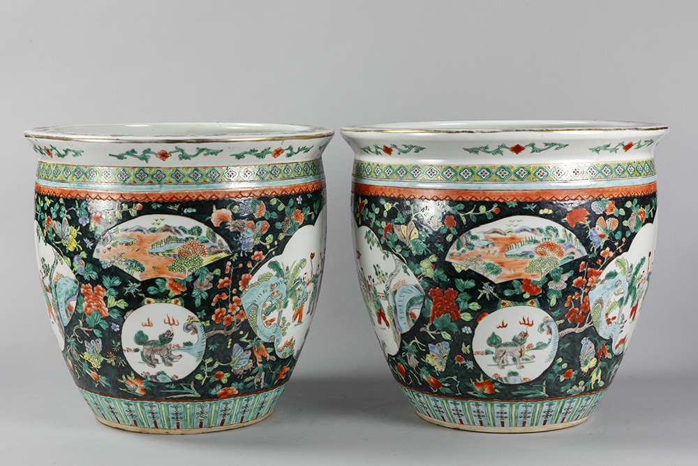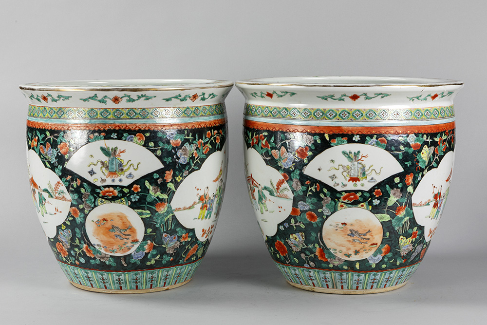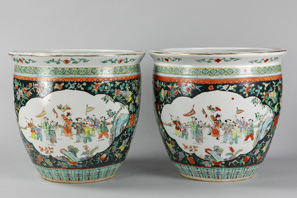 Paar Chinese jardinières in porselein met een Famille Noire-decor decor met polychroom figurendecor – diameter : 39,5 cm