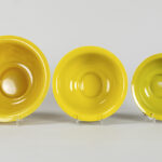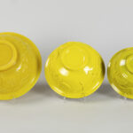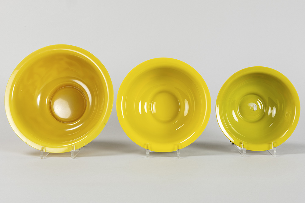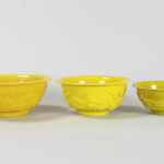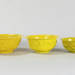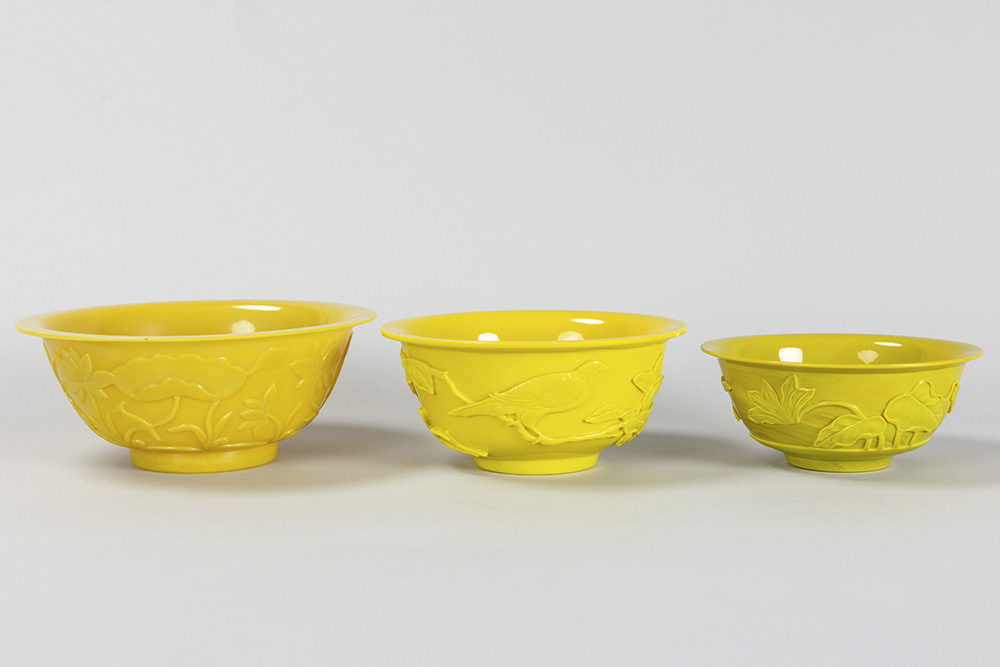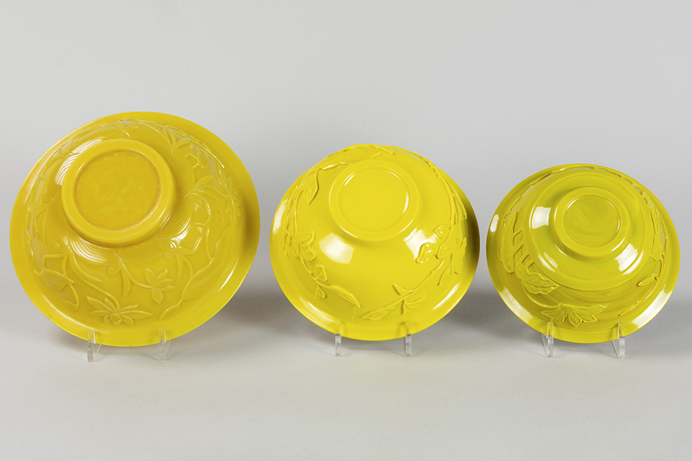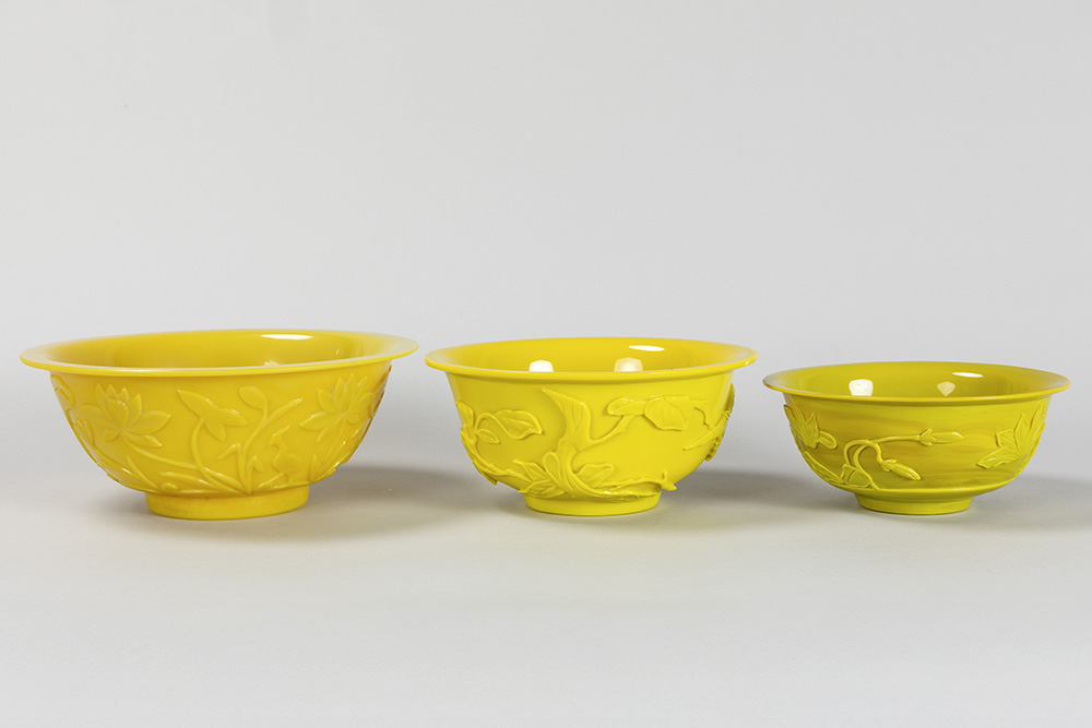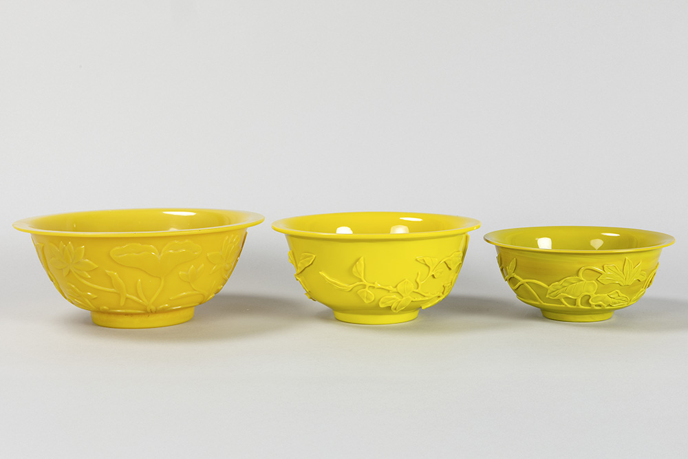 PEKING GLAS – 19°/20° EEUW lot van drie bowls met decors (vegetaal, floraal en vogels) op gele fond – diameters van 18 tot 24 cm
