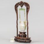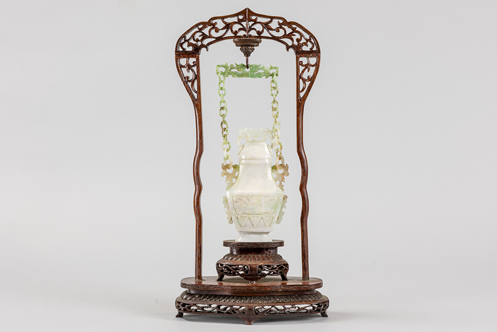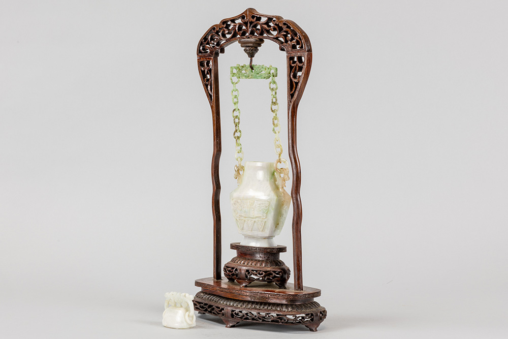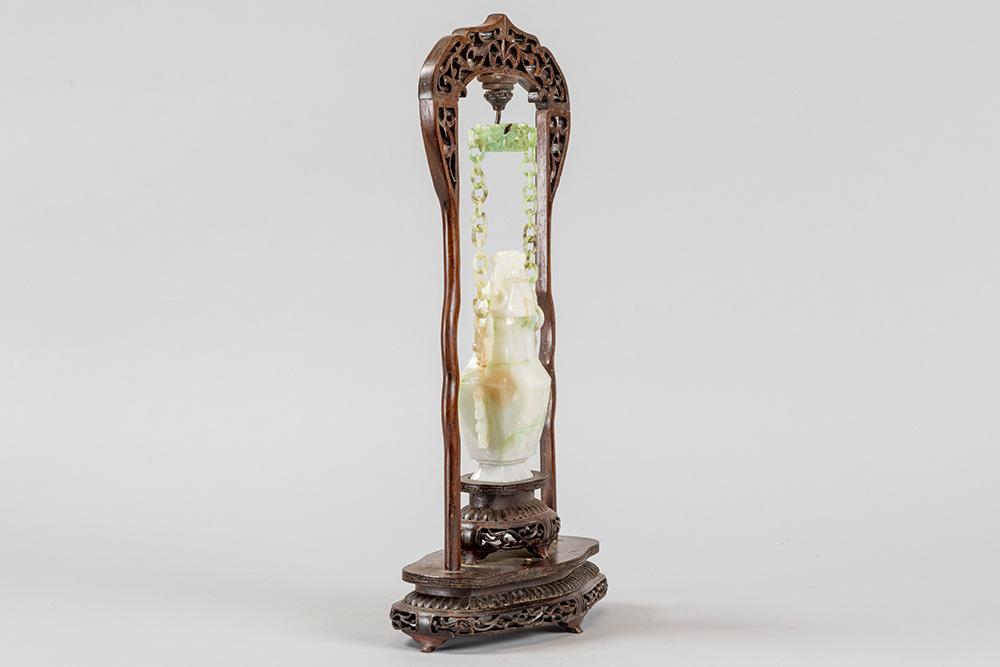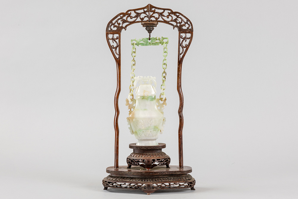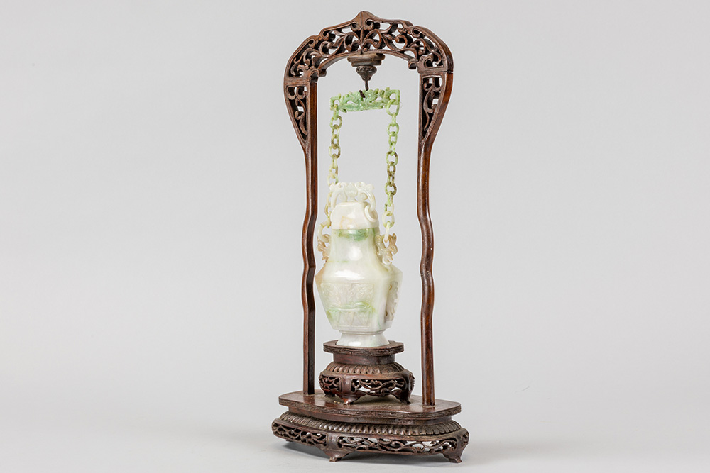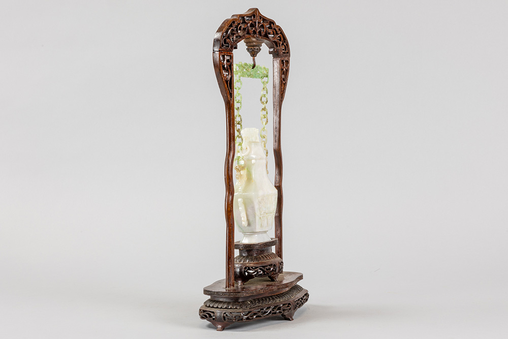 Chinese gedekselde vaas in jade, hangend in een houten montuur – totale hoogte : 39,5 cm