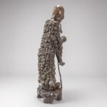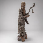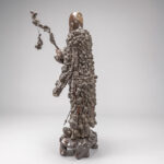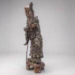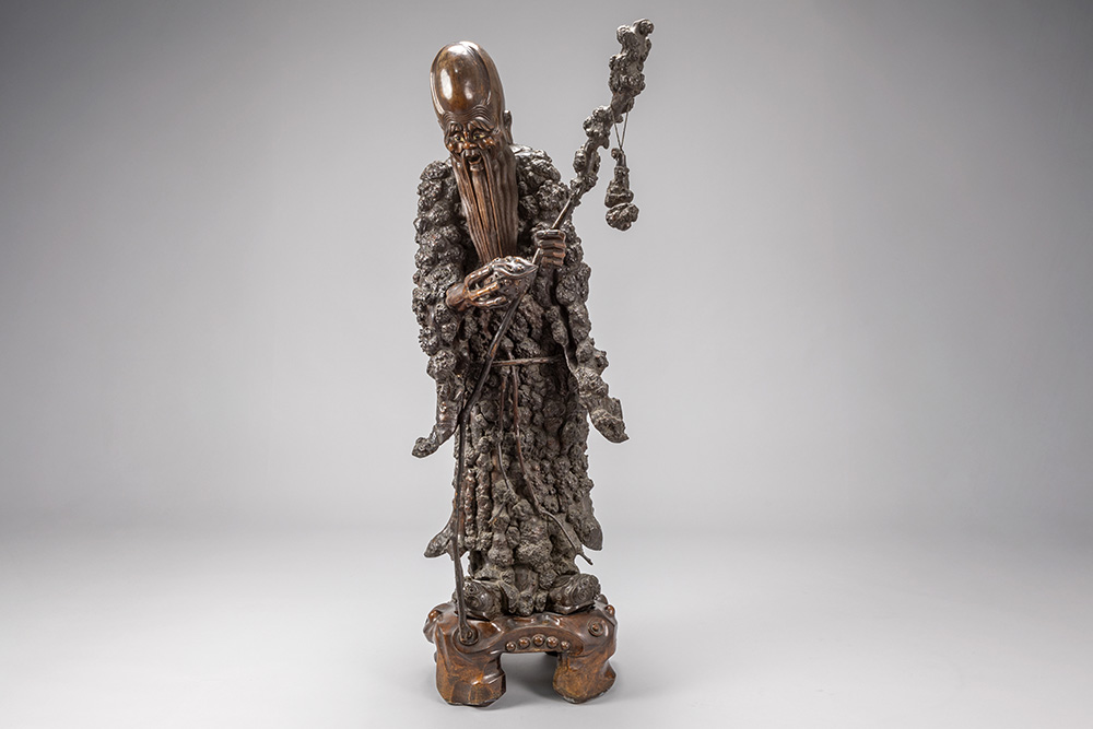 Vrij grote, antieke Chinese sculptuur in wortelhout met de voorstelling van een Wijze met stok, allicht “Lao Tzu”, op een gesculpteerde houten sokkel – hoogte : ca 144 cm