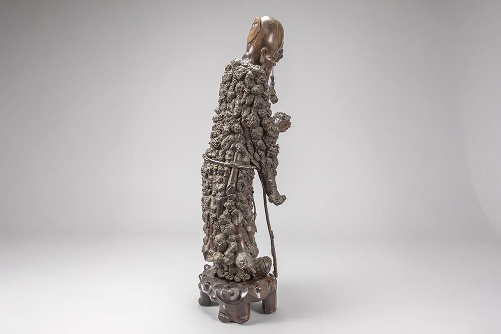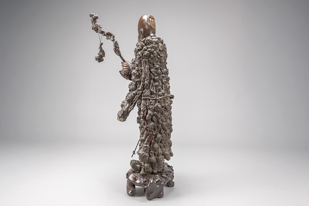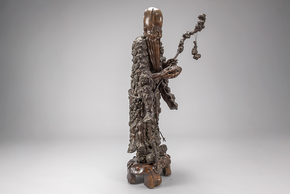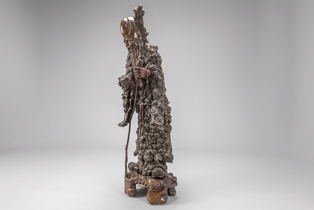 quite big antique Chinese “Sage” sculpture in burr root-wood, presumably depicting “Lao Tzu”, on a sculpted wooden base