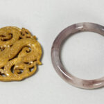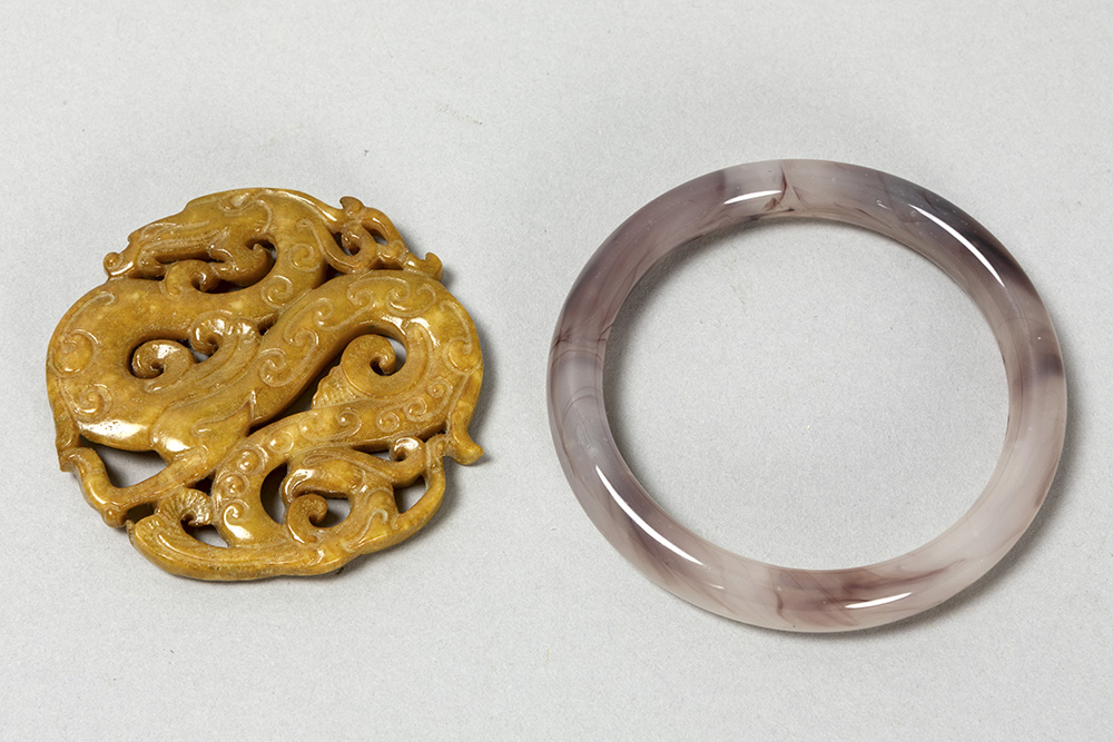 Chinese bracelet in pinkish stone and pendant in ochre-color stone