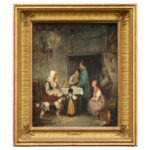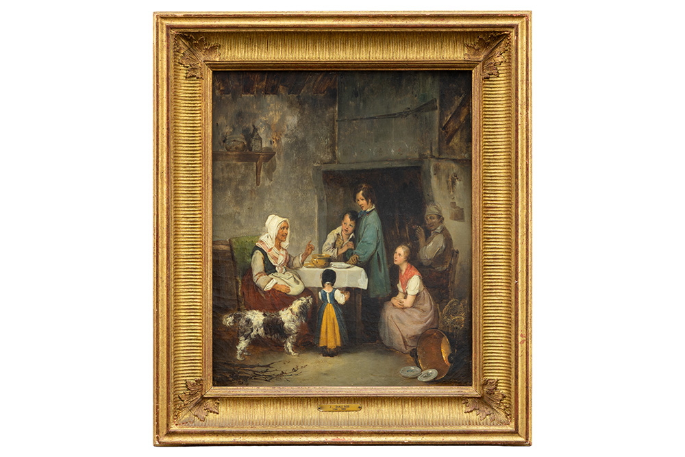 BEAUME JOSEPH (1796 – 1885) (FR) olieverfschilderij op doek met een romantisch genretafereel met zes personages en een hond in een interieur : “Grootmoeder vertelt” – 45 x 36 getekend en onleesbaar gedateerd