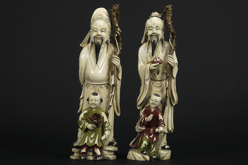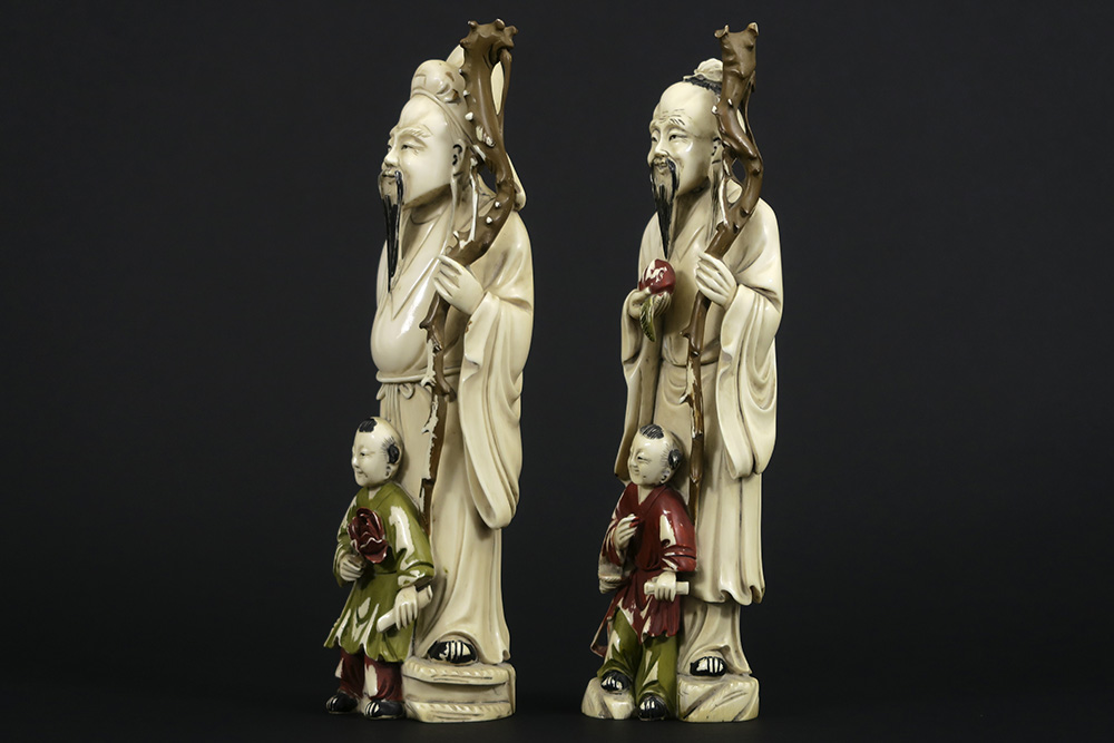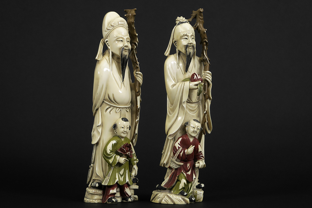 Paar antieke Chinese sculpturen uit de late Qing-periode in deels gepolychromeerde ivoor : “Man met perzik en kind” en “Man met staf en kind met lotusbloem” – hoogtes : 25 cm – gewicht : 1414 gram – ca 1890 – telkens op sokkel