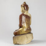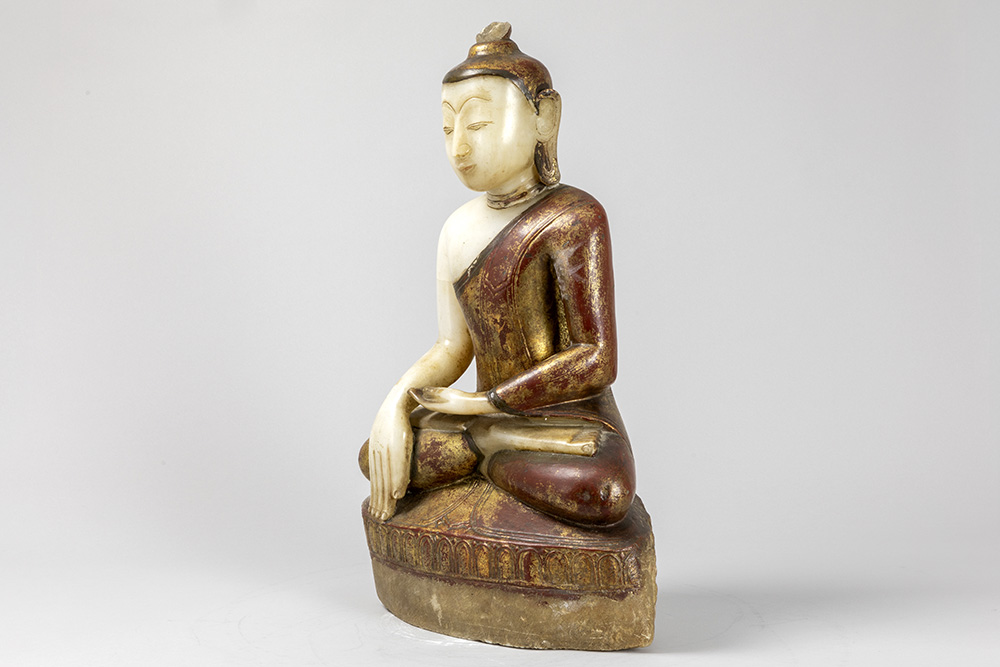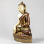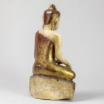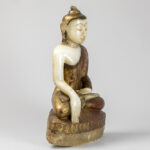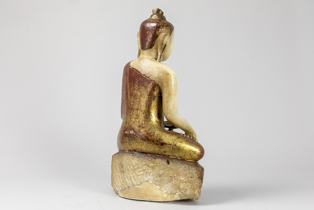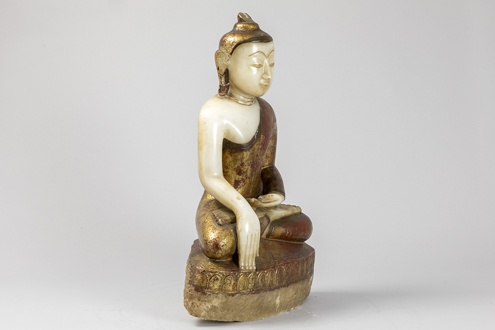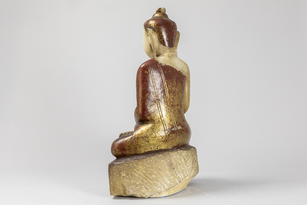 Antieke Birmaanse Shan-sculptuur in albast met restanten van het originele lakwerk en dorure : “Zittende Boeddha” – hoogte en breedte : 62 en 40 cm