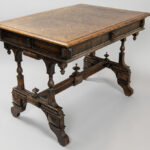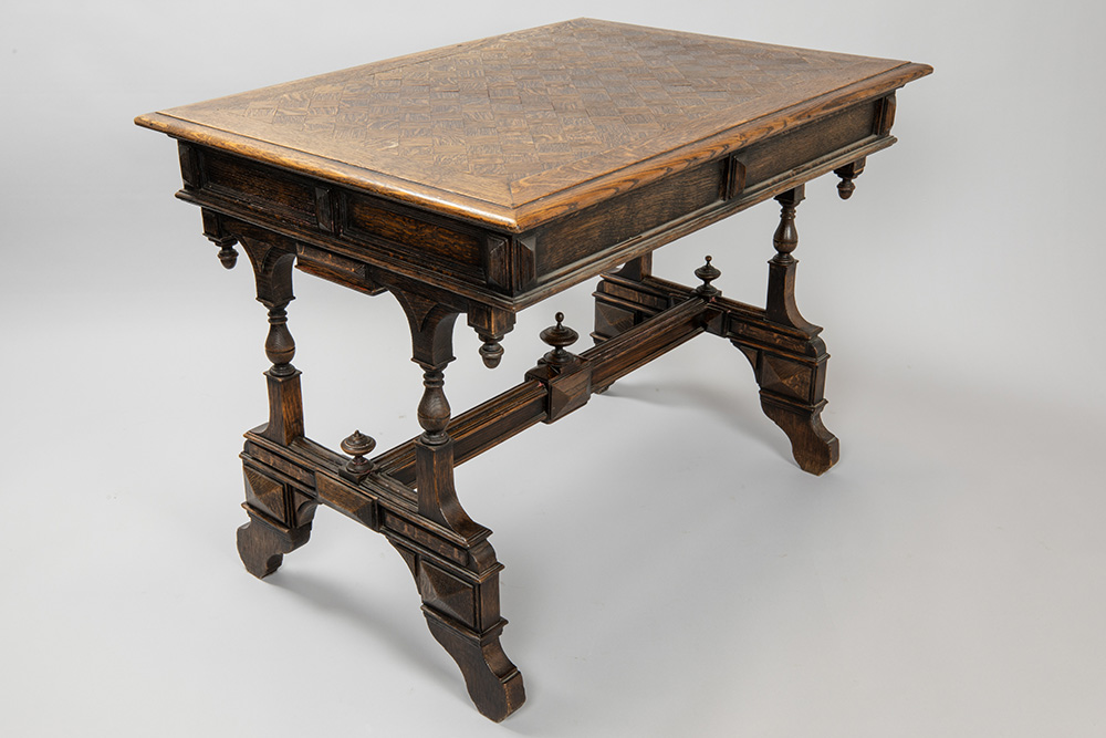 Antieke bijzettafel met wangenpoten en geparquetteerd blad in eik – 74 x 98 x 70 cm