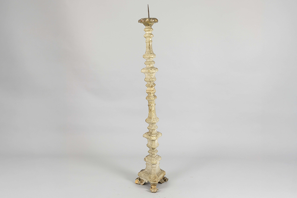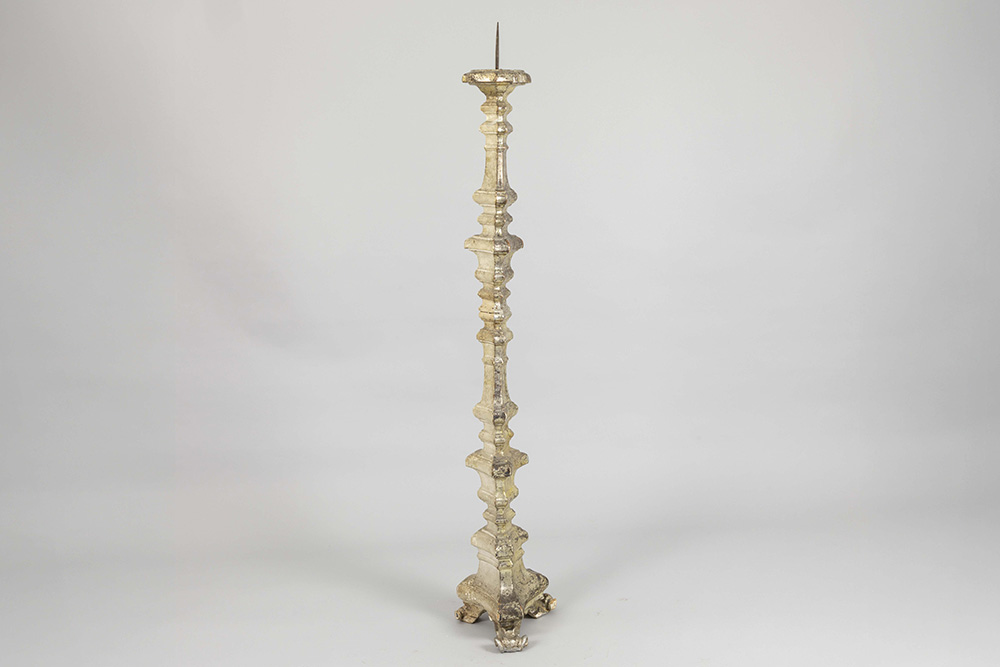 Grote antieke kerkkandelaar in hout met zilverpatine – hoogte : 157 cm