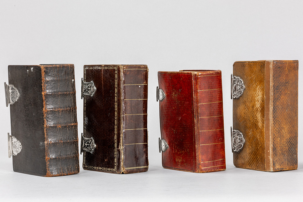 Lot van vier antieke in leder ingebonden ‘bijbels’, telkens met een dubbel slot in massief zilver
