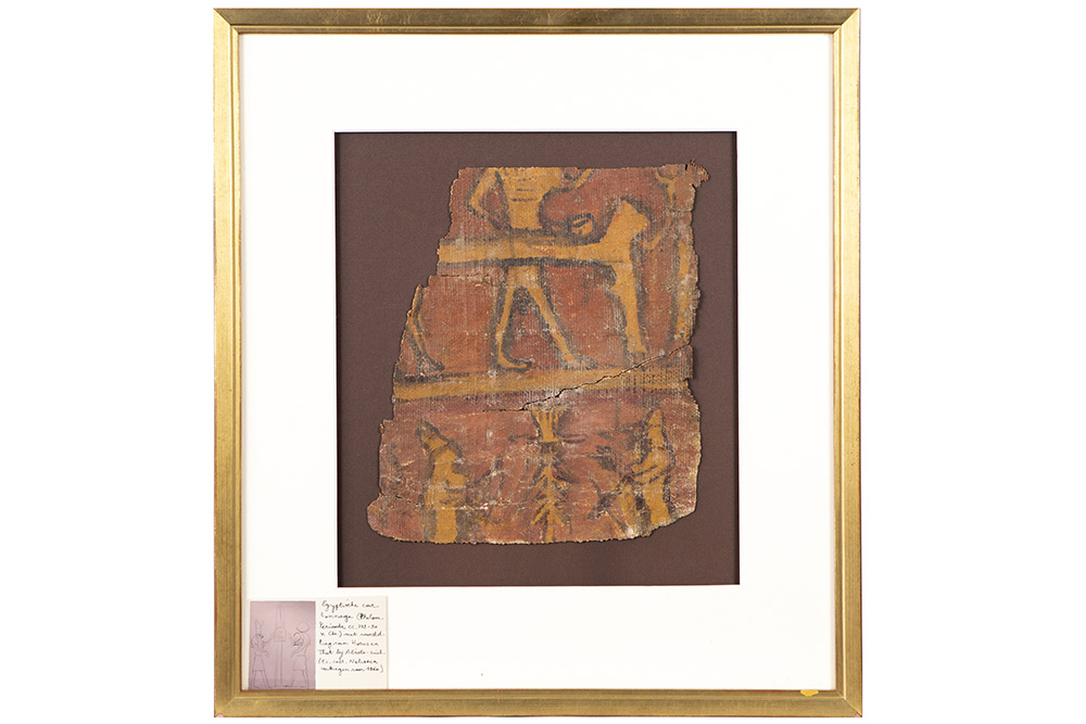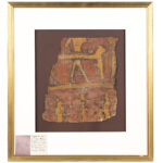 framed fragment of an Ancient Egyptian Ptolemaic period gesso cartonnage with the partial depiction of Horus and Thot