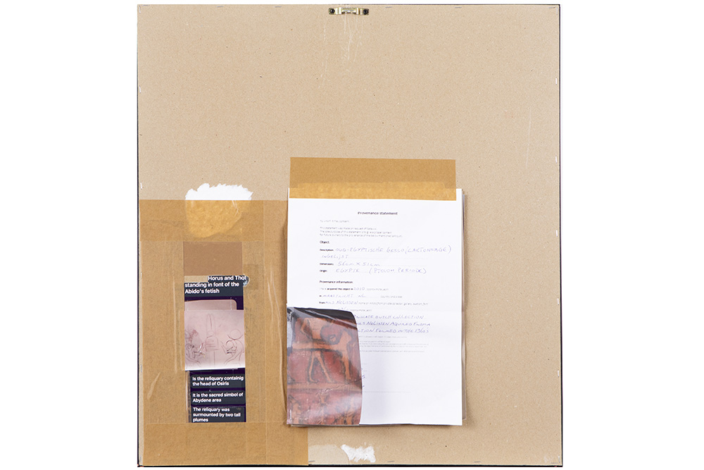 OUD-EGYPTE – PTOLEMAISCHE PERIODE (332 – 30 BC) fragment van een kartonnage in gesso met gedeeltelijke voorstelling van Horus en Thot – 29,5 x 25,5 – ingekaderd prov : vroegere collectie van Mevrouw Nelissen – Maastricht