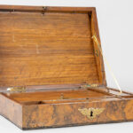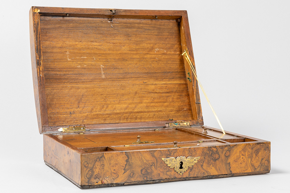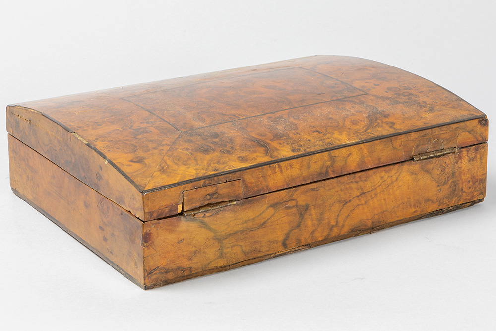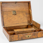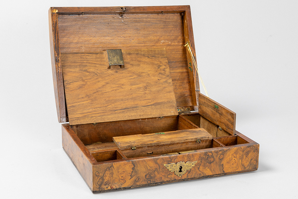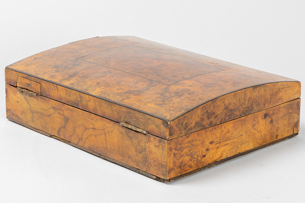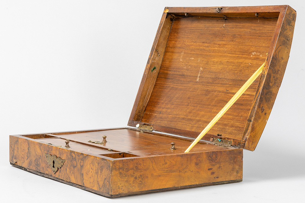 Antieke koloniale schrijfkist in wortelhout – 9,5 x 34 x 25 cm