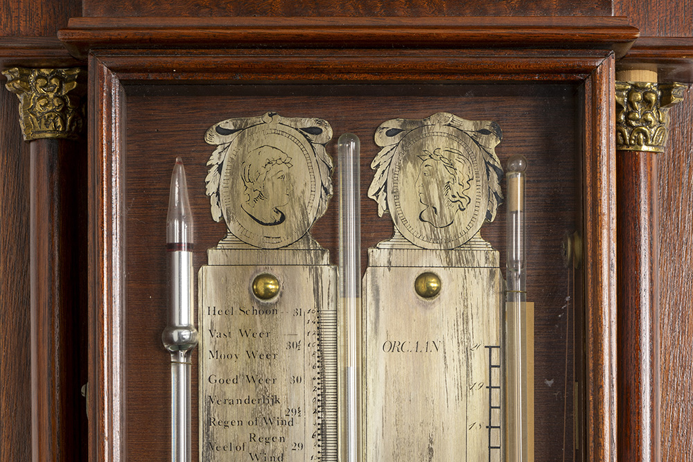 ROSELLI antieke Nederlandse thermometer met mooie neoclassicistische kast in verschillende houtsoorten – hoogte : 135 cm getekend