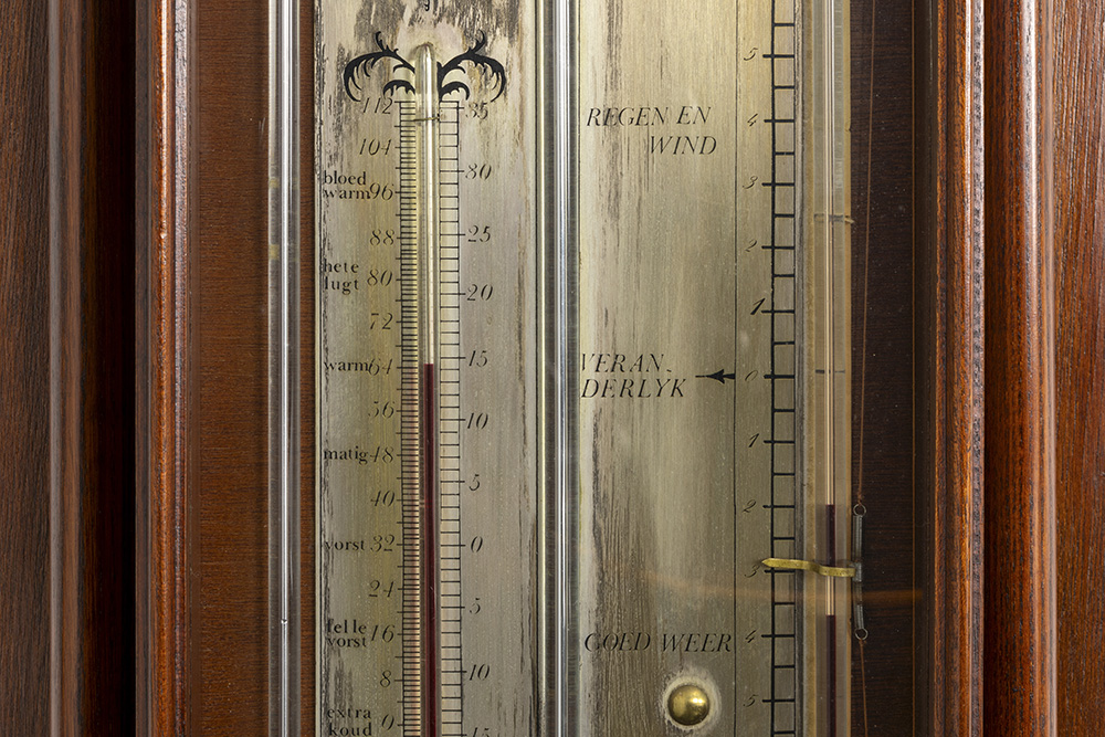antique Dutch Roselli marked thermometer with its neoclassical case in several types of wood
