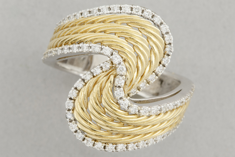 quite special ring in white and yellow gold (18 carat) and with 0,70 carat of high quality brilliant cut diamonds – size 54