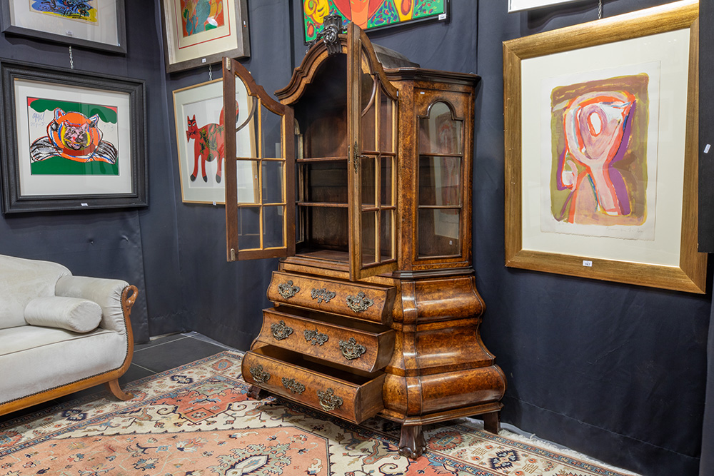 Mooi antiek, door het kleine formaat zeldzaam vitrinemeubel in wortelhout met dubbelgebogen buik met drie laden met fraai Lodewijk XV-bronsbeslag en met bovenaan twee deuren en een getrapte kop – 202 x 150 x 50 cm