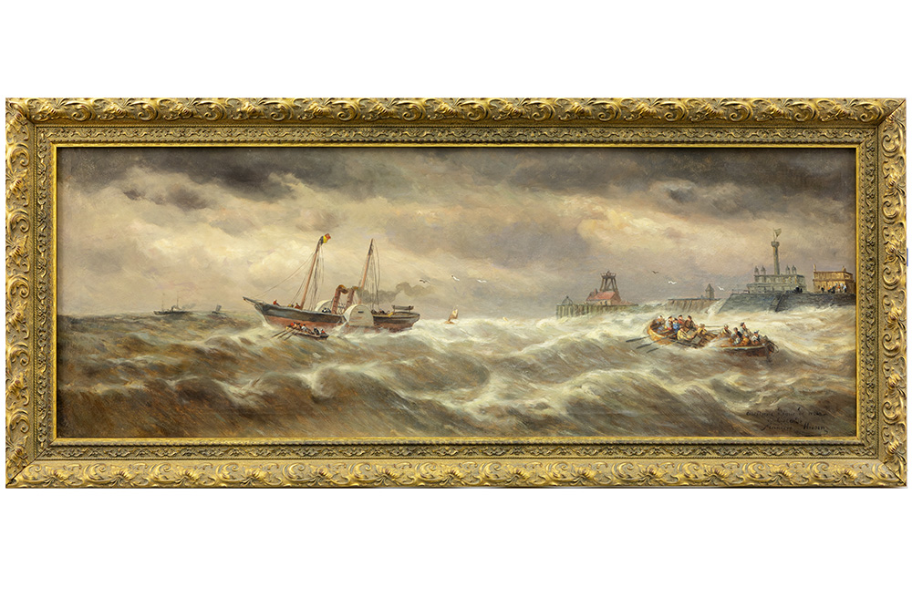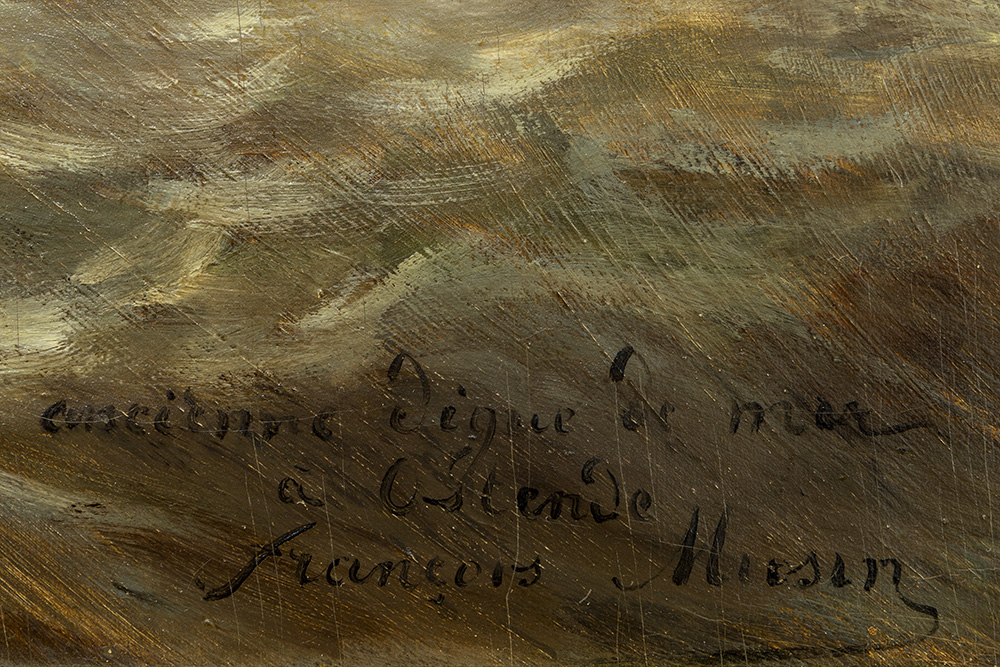 MUSIN FRANÇOIS (1820 – 1888) olieverfschilderij op doek getiteld “Ancienne digue de mer à Ostende”  –  42 x 118 getekend