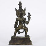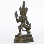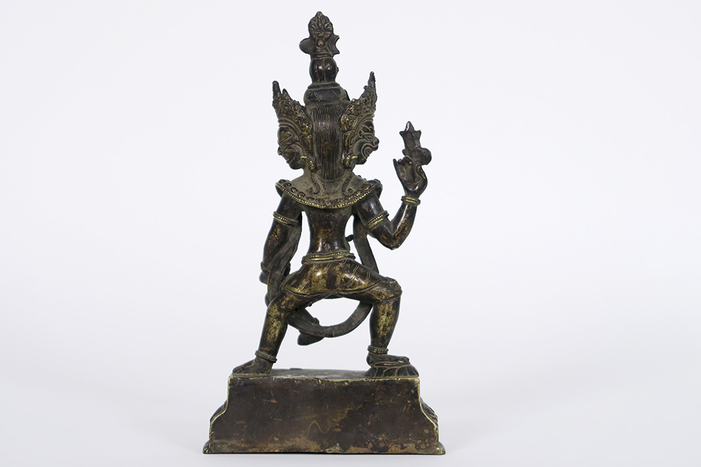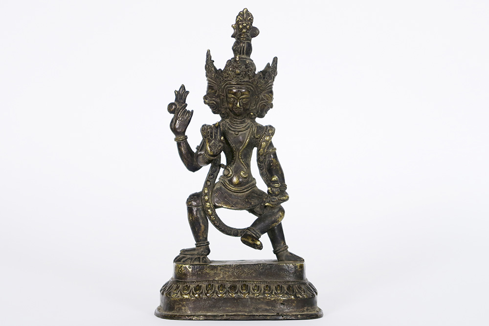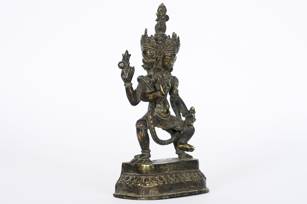 Tibetaanse tantrische sculptuur in een koperlegering met de voorstelling van een gekroonde godheid met drie benen, handen en hoofden, wellicht “Vairocana” – hoogte : 27 cm – gewicht : 1100 gram prov : collectie familie Dhakhwa – Kathmandu (van omstreeks 1900 en ervoor) – Belgische verzamelaar