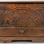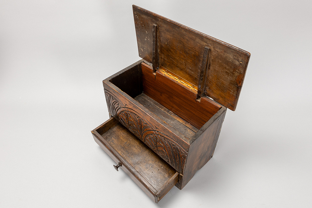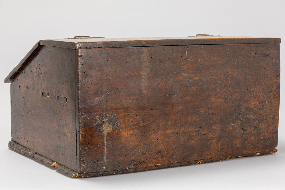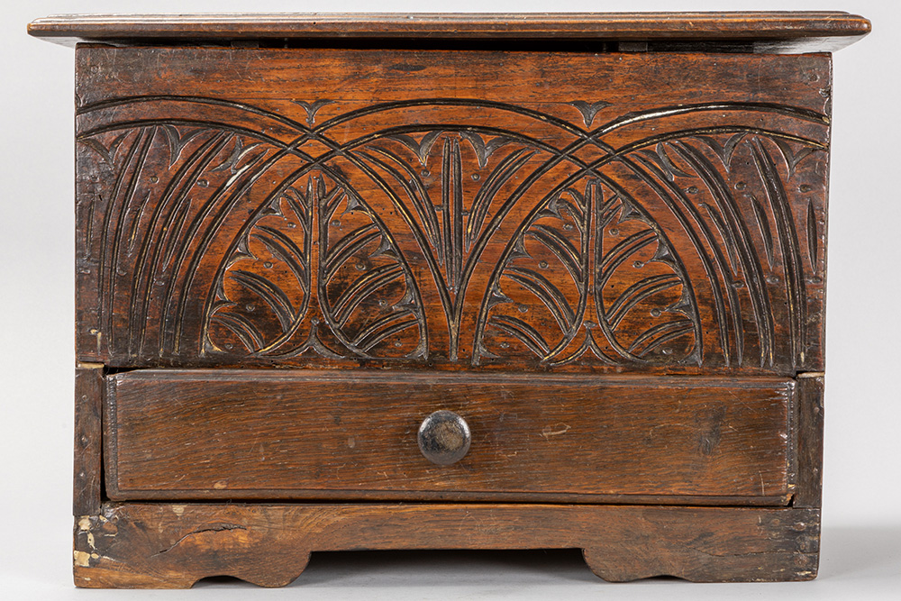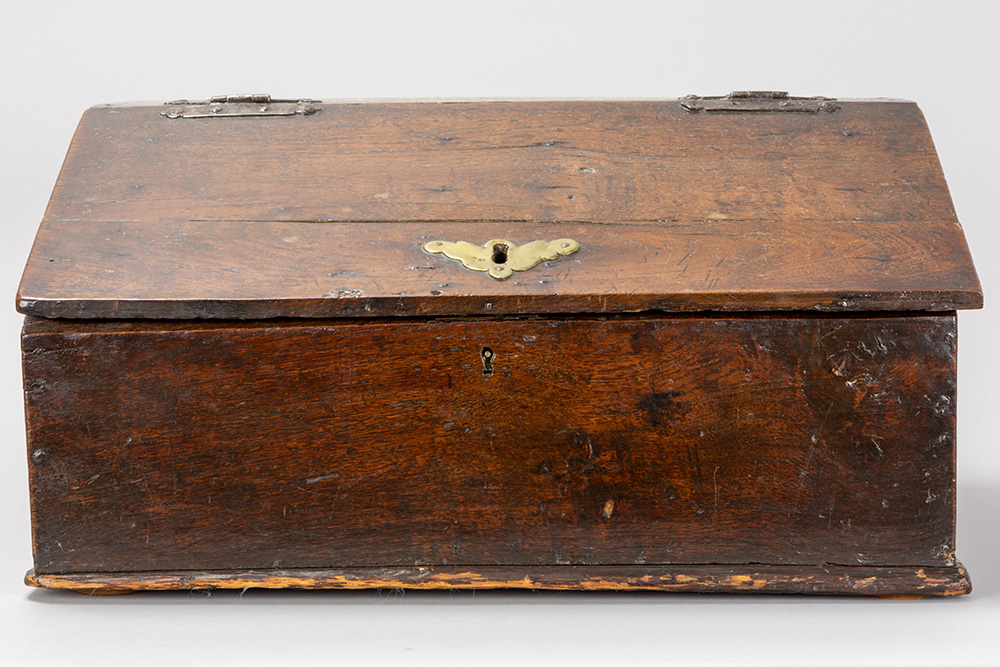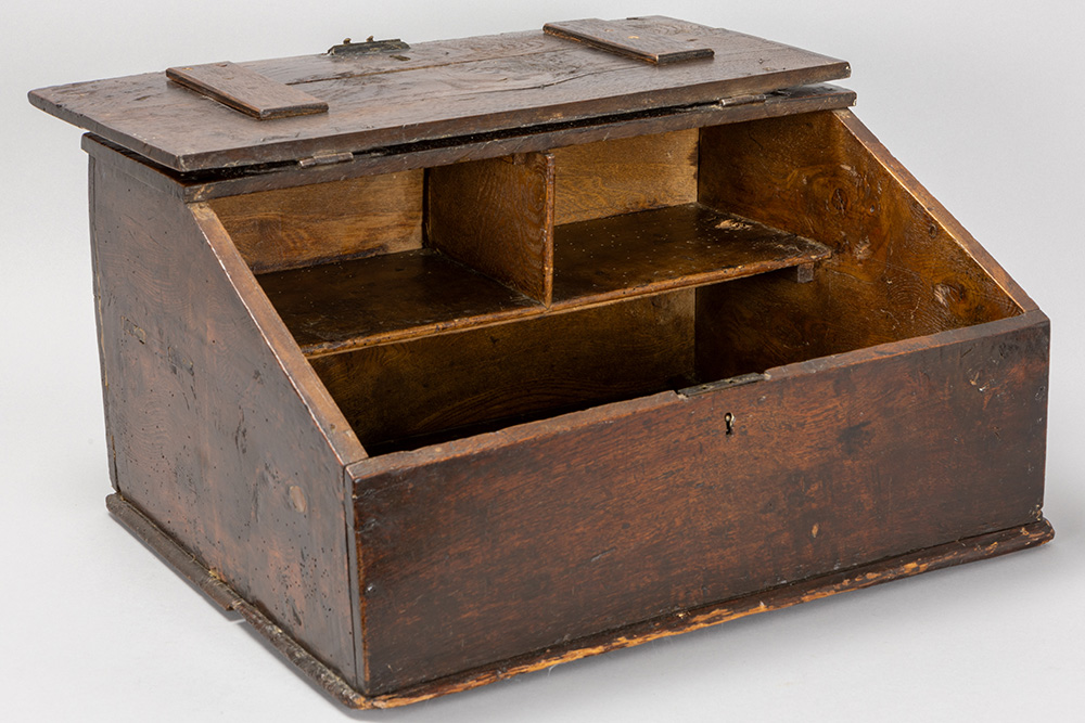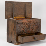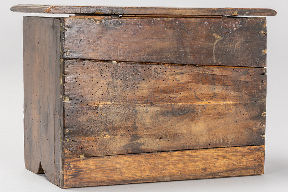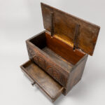 Lot van twee kleine antieke Engelse kistjes in eik : één met lade en een zgn “bible box” uit de 18° eeuw