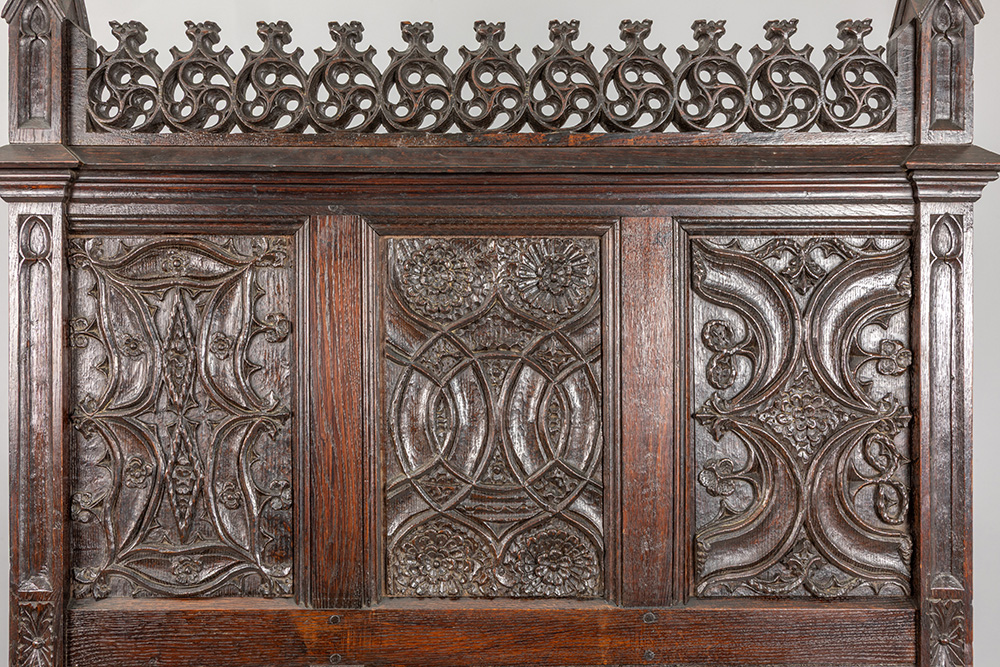 Antiek eiken (haard)scherm in Hooggotische stijl met typisch gesculpteerde ornamentiek – hoogte en breedte : 170 en 105 cm