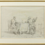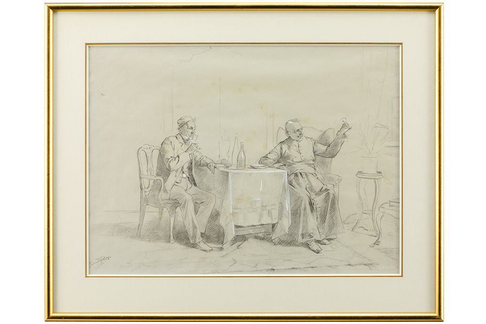 PORTIELJE GERARD (1856 – 1929) tekening : “Wijnproevende religieuze en man”  –  42 x 57 getekend