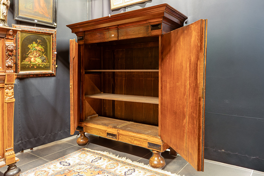 Achttiende eeuwse Hollandse kussenkast in wortelhout, notelaar, ebbenhout en geëboniseerd hout met lade en twee deuren met typische ‘kussens’ – 202 x 188 x 70 cm