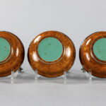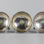 Lot van drie Tibetaanse bowls in wortelhout en zilver, telkens met een geïncrusteerde turkoois – diameters : 11,5 cm