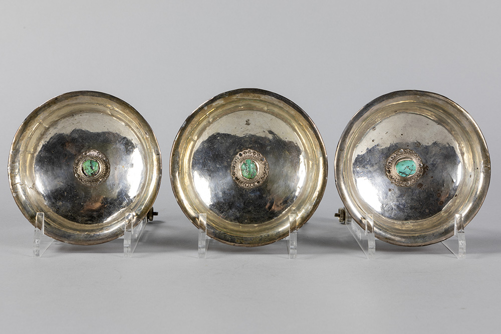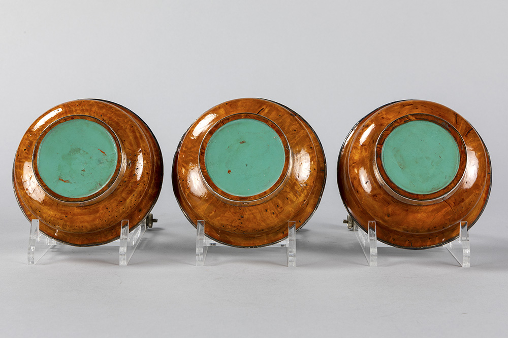 three Tibetan bowls in burr wood and silver, each with an incrusted turquoise