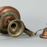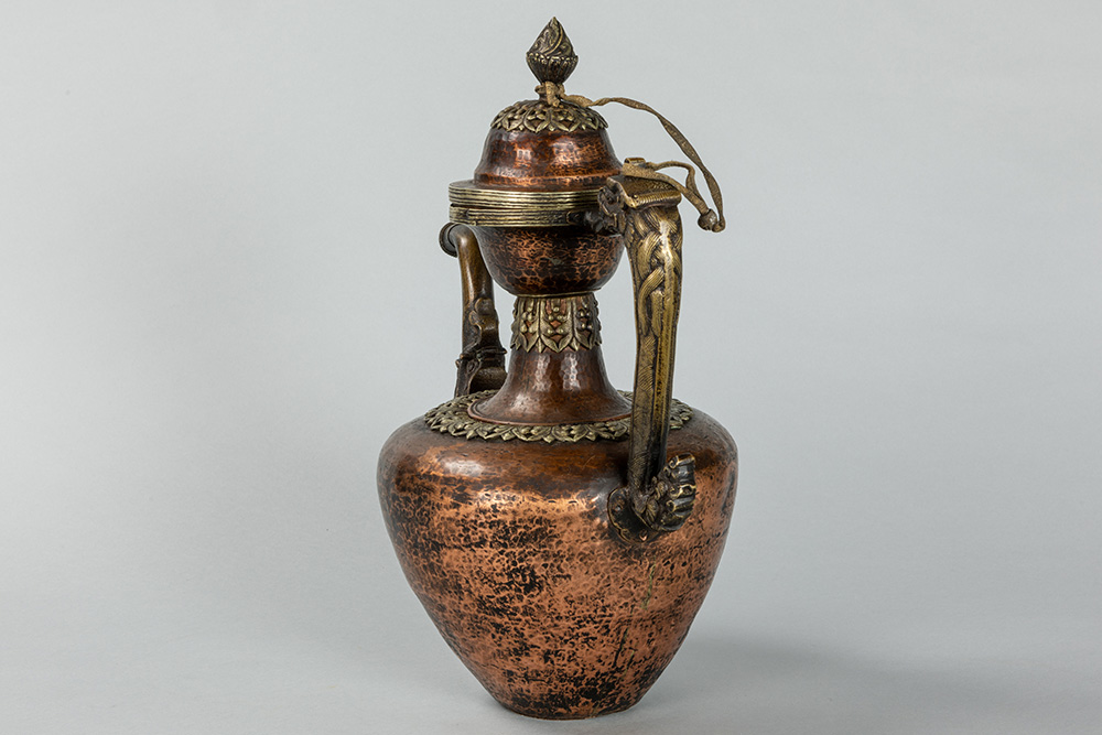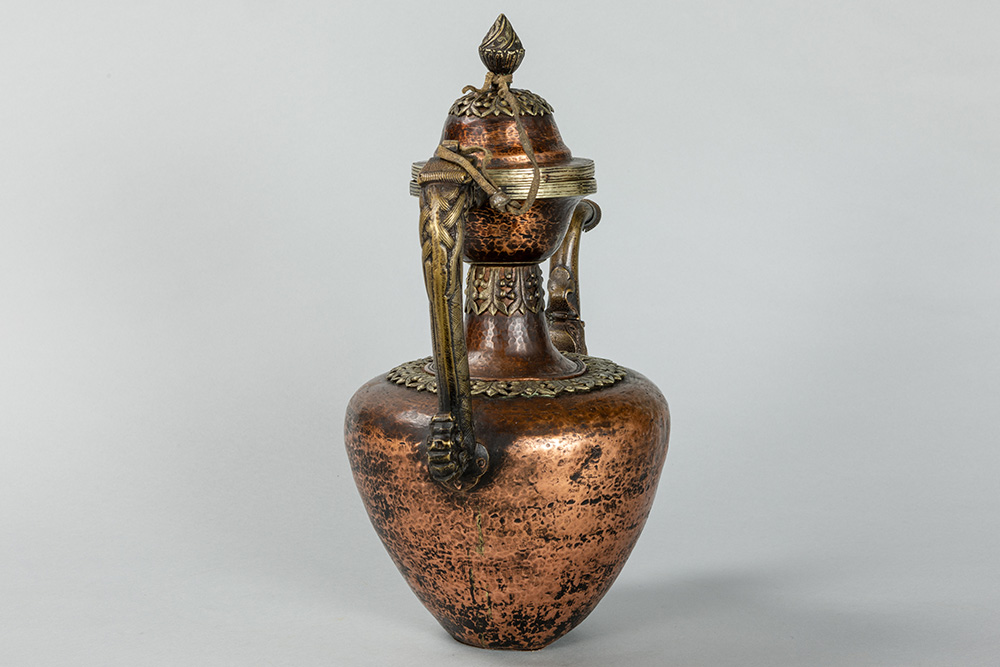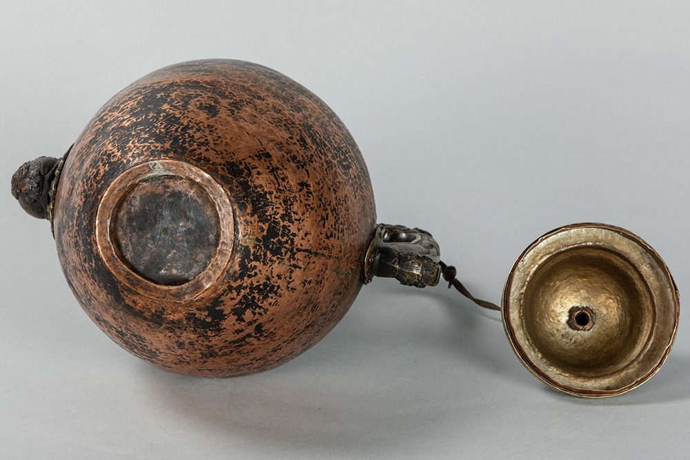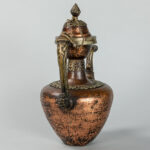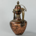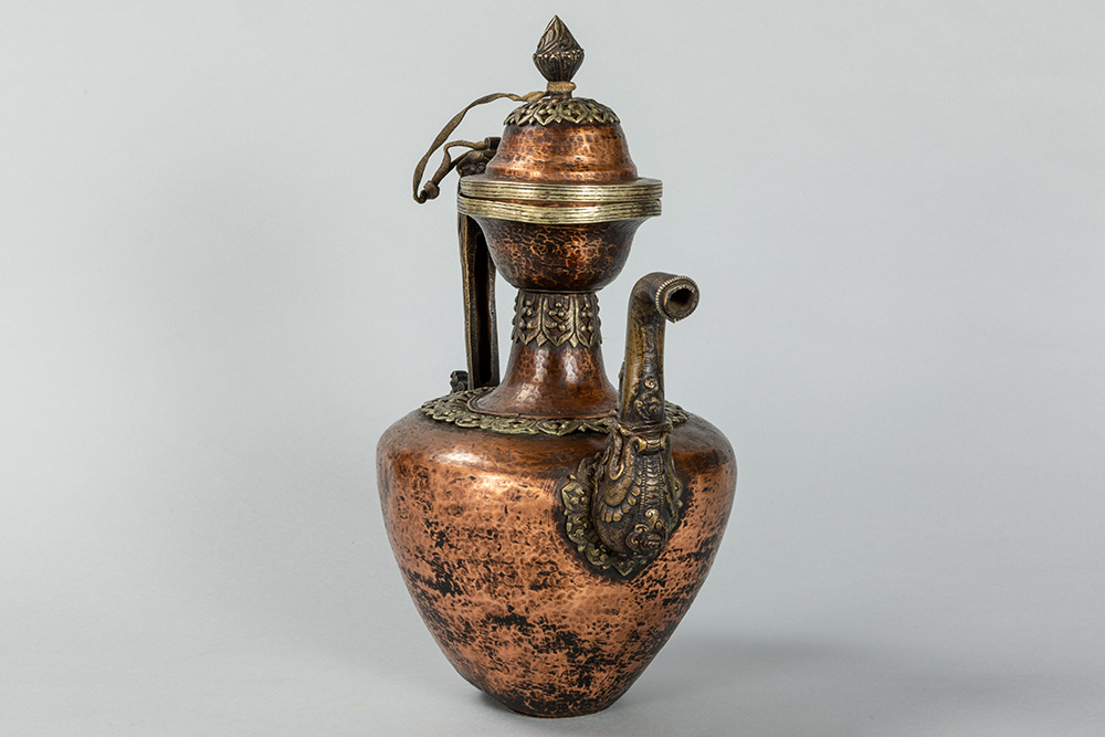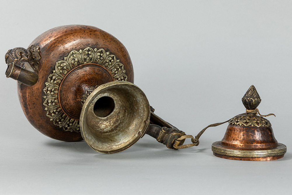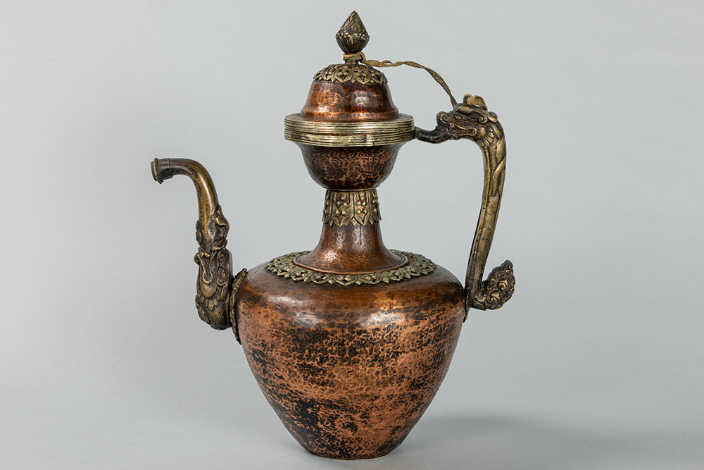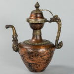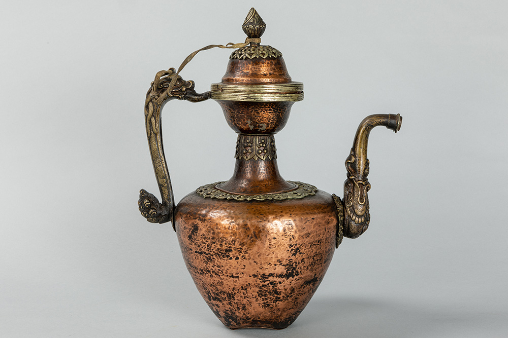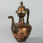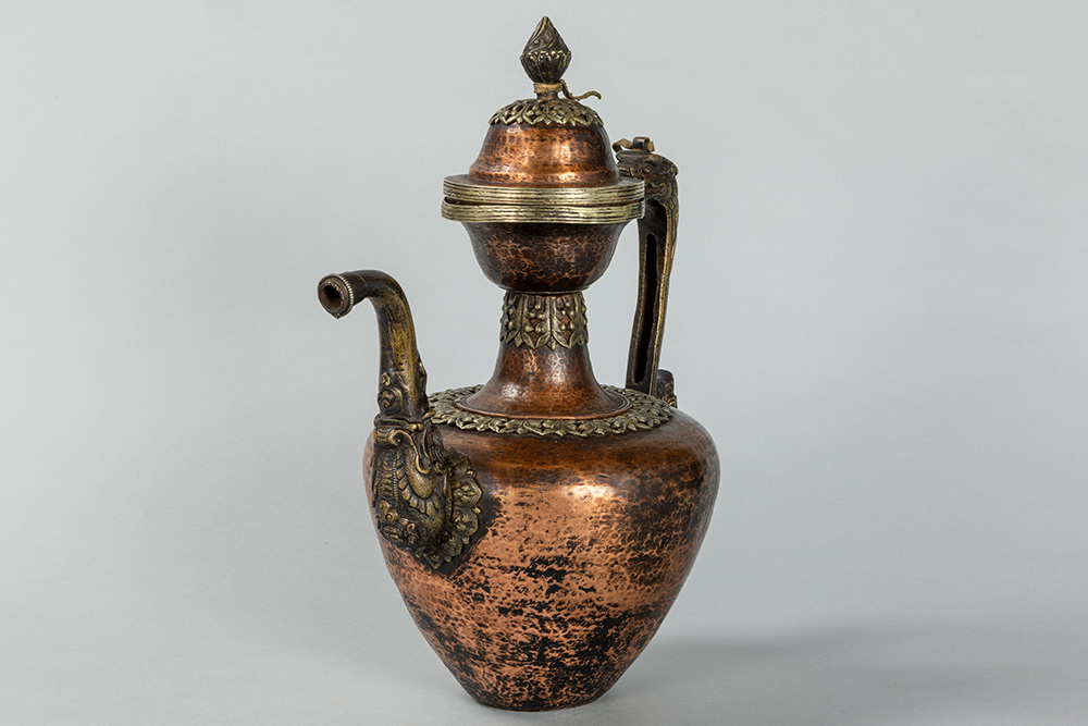 ’antique’ Tibeto-Nepalese teapot in red brass with appliqued ornamentation in silver and with a dragon’s head handle and elephant’s head spout