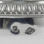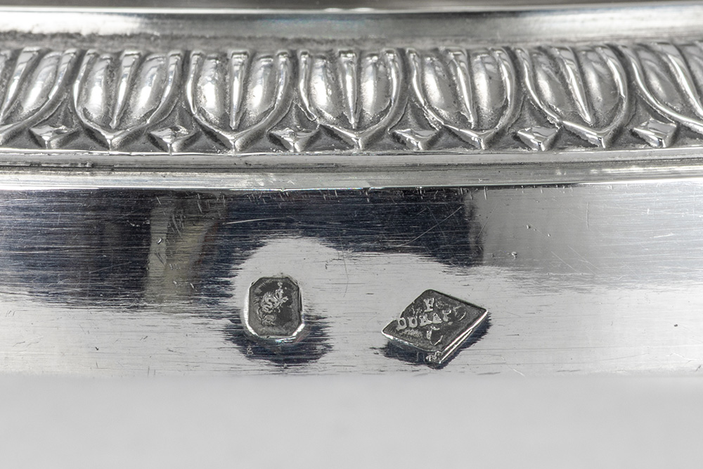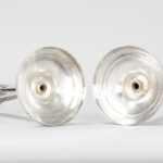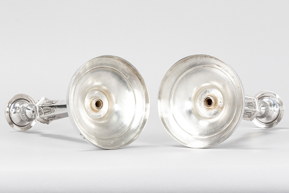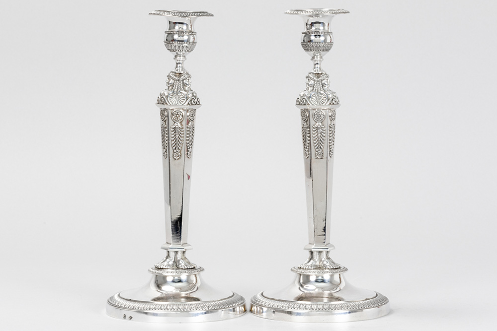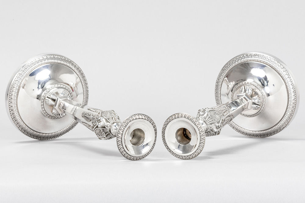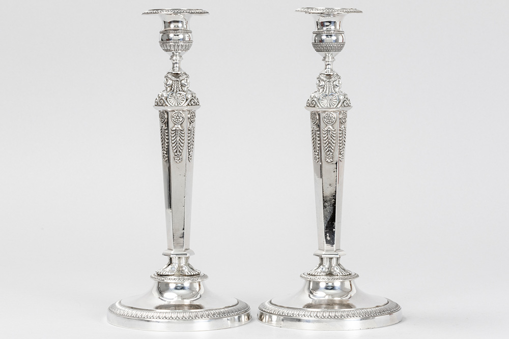 FRANCOIS DURAND (Paris, 1819 – 1838) paar antieke Franse Empire-kandelaars in massief zilver, gemerkt “1ste gehalte”, met typische ornamentiek met vrouwenhoofdjes en -voeten – hoogte : 27,5 cm – gewicht : 1080 gram – ca 1830 getekend François Durand, leerling van Odiot, was de zilversmid van de Hertog van Orléans