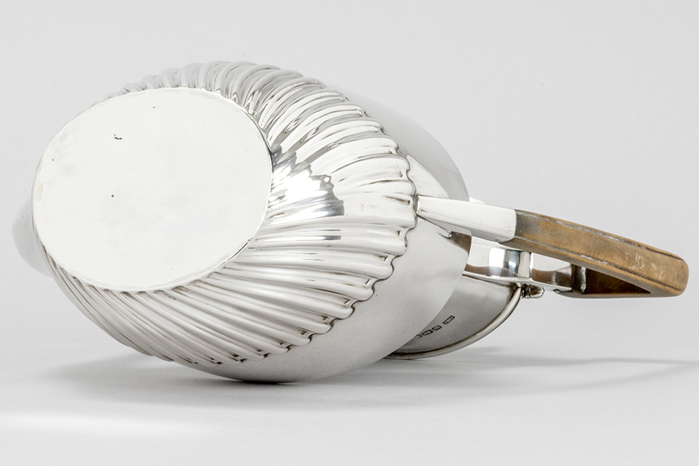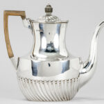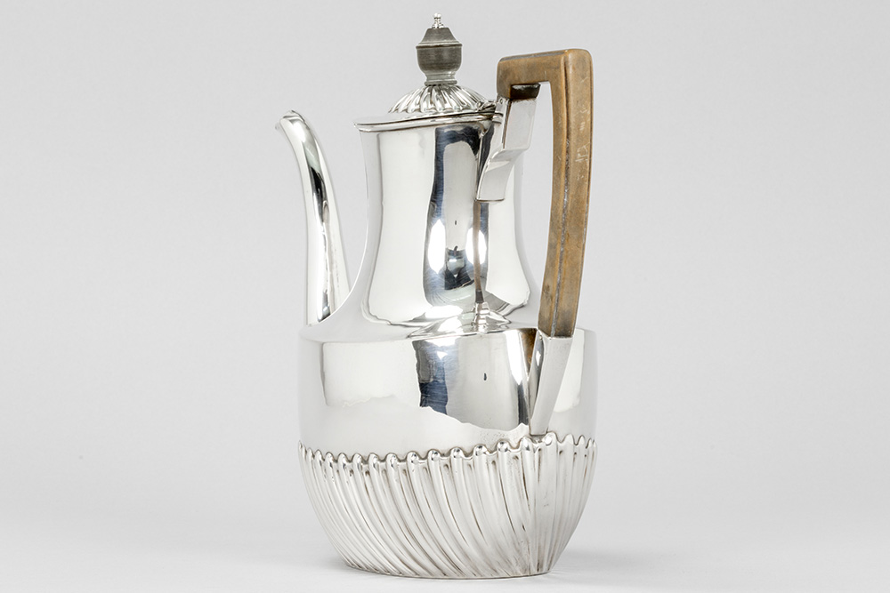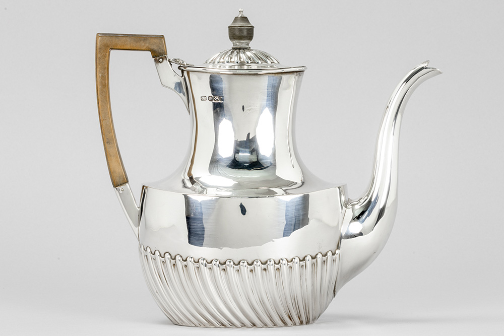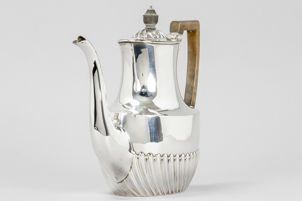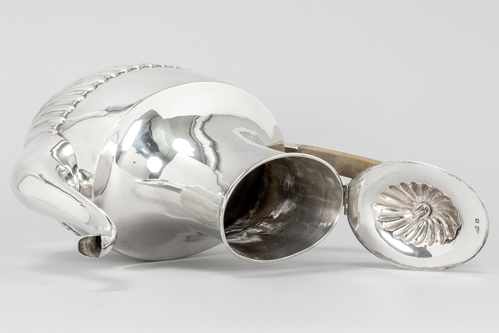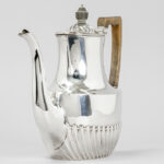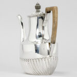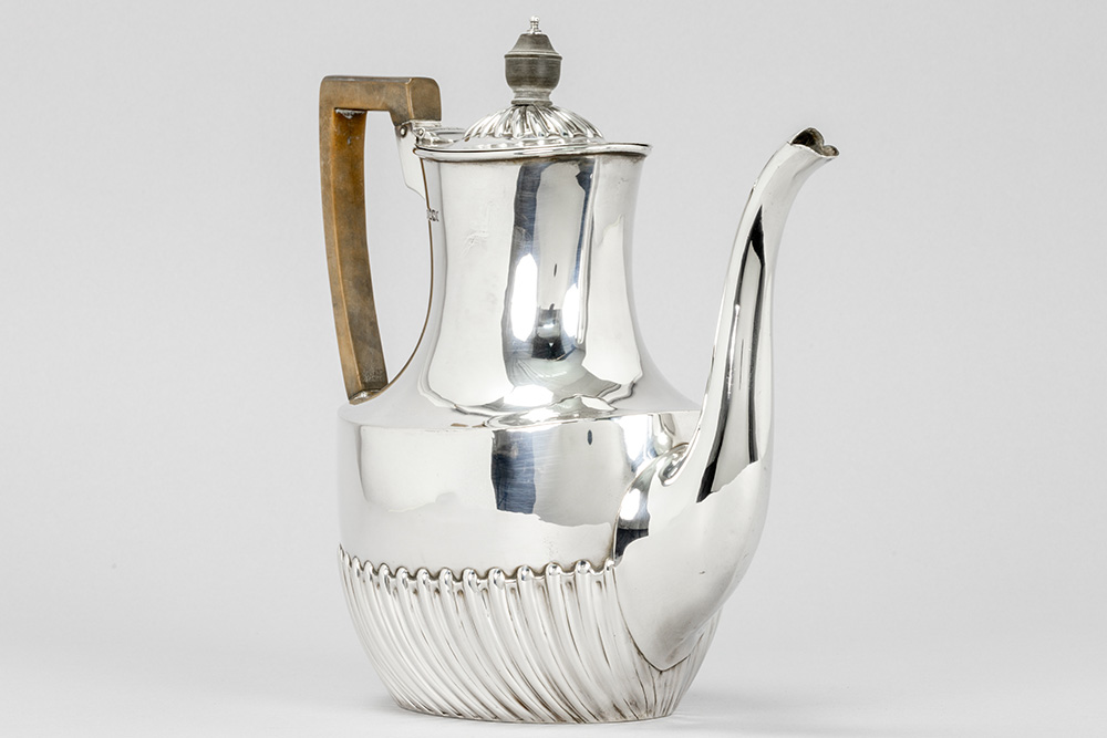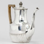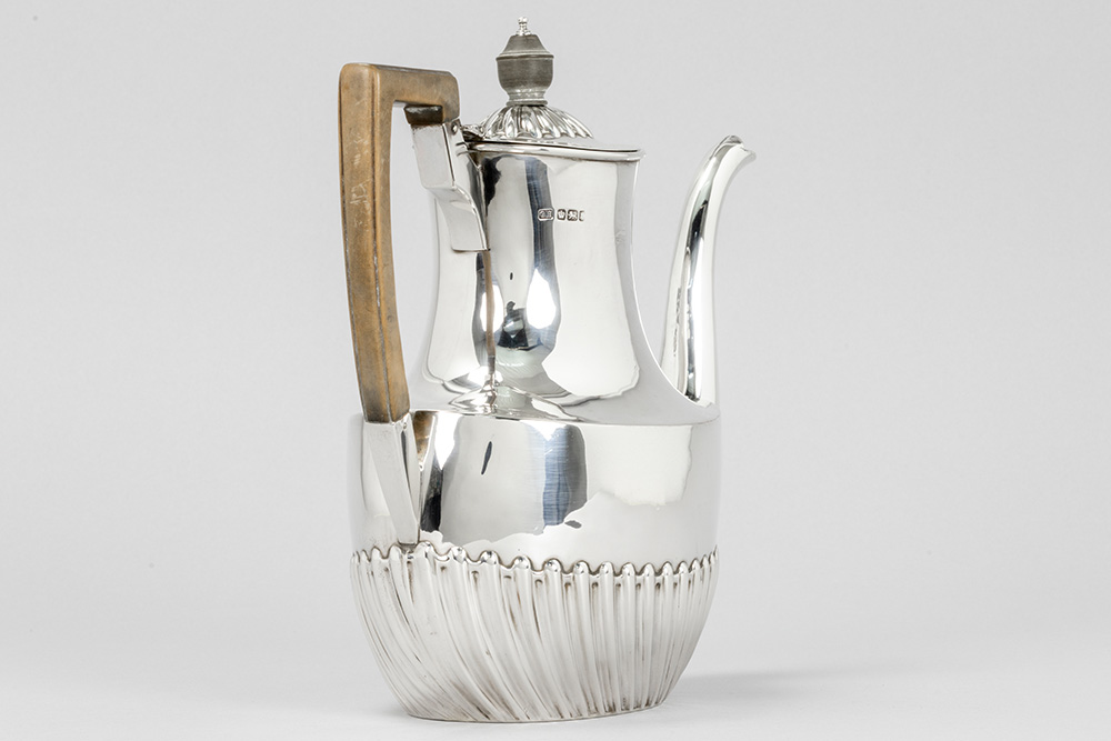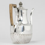 Mooie antieke koffiekan met klassieke vorm en lobversieringen (op de buik en deksel) in massief zilver, gemerkt ‘925 – Sheffield 1900’ – hoogte : 22,5 cm – gewicht : 516 gram